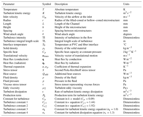Table 1Model input parameters include: inlet wind speed (Uin), wind attacking angle (θ), turbulence intensity (TI), and geometry parameters including the radius (r), height (h), and spacing (s) of the microstructures used in geometry combinations.