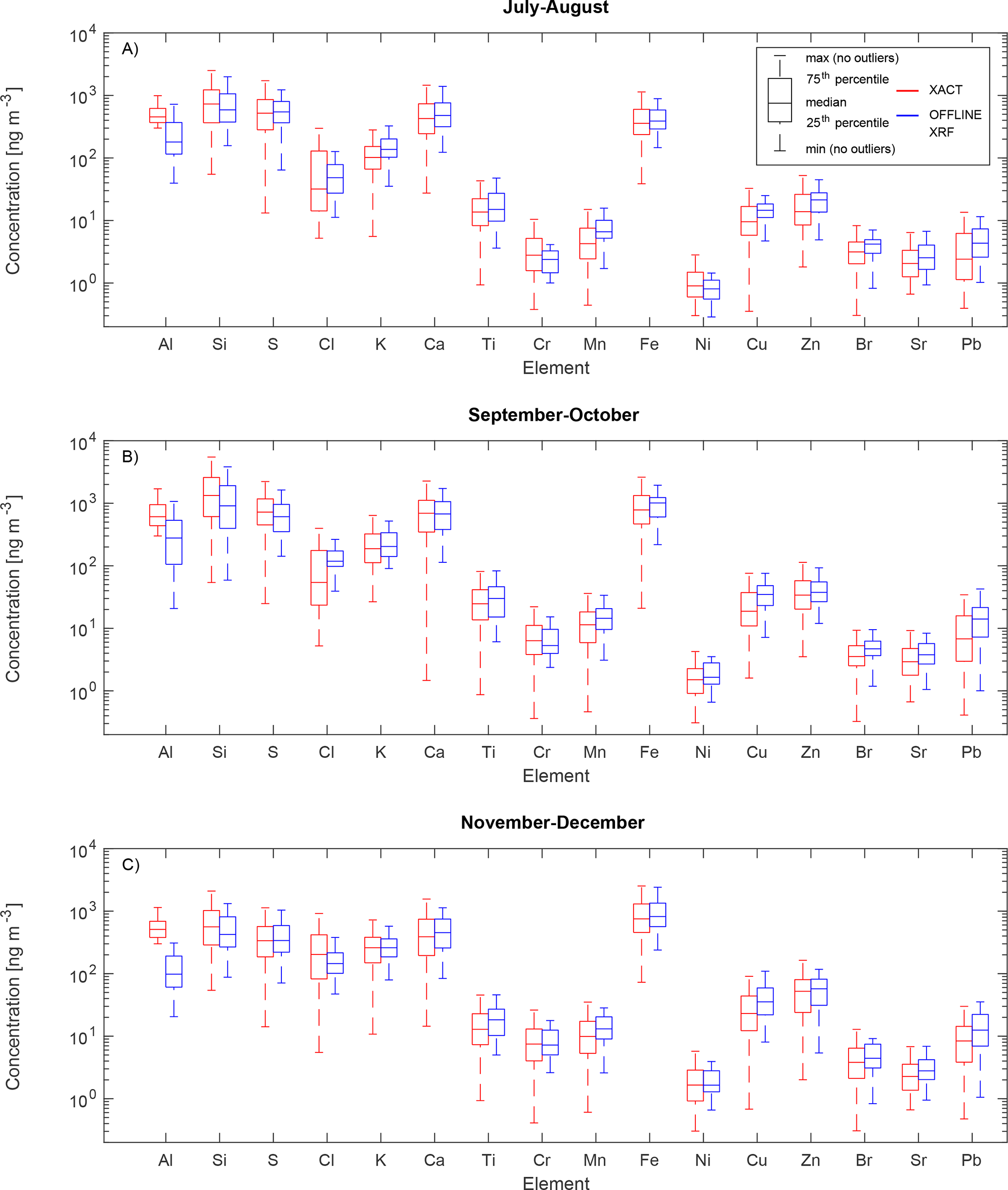 An overview of the data recorded during the experimental campaign is given in Fig. 1, taking into account all available valid data of the elements considered for the intercomparison. To account for seasonal differences in terms of meteorology and emissions, data were divided into three periods: July–August, September–October, and November–December. The basic statistics of the dataset, including the mean, median, standard deviations, and 25th and 75th percentiles, are reported in Table S7 in the Supplement. As previously mentioned, the Xact® 625i data coverage for July and August was impacted by the loss of data mainly related to the time interval 13:00–16:00 LT when hot temperatures caused the X-ray tube to switch off; therefore, the statistical robustness of the comparison is lower than in the other represented periods.