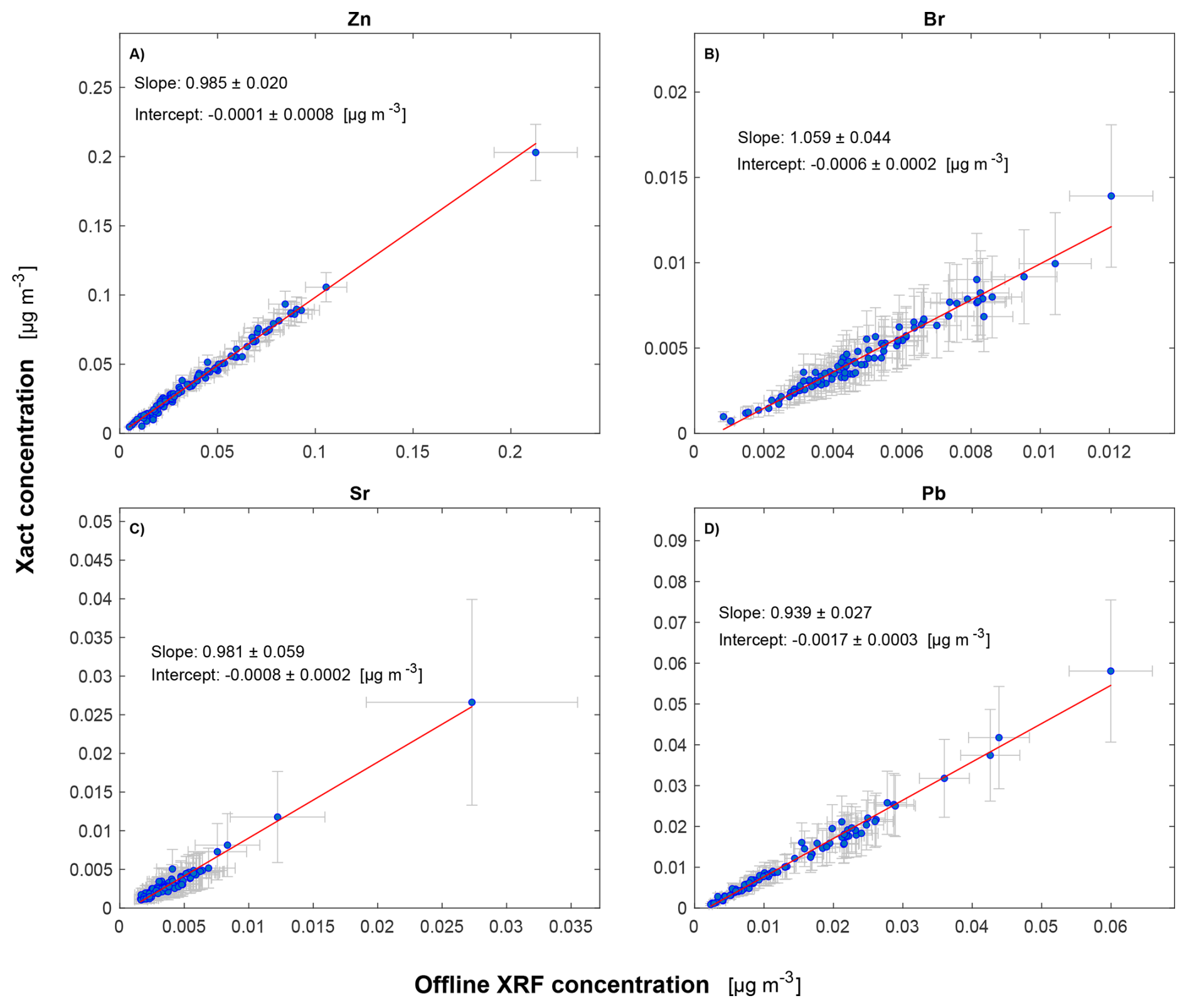 Figure 3Scatterplots of the intercomparison between Xact® 625i data and offline ED-XRF data for the elements Zn, Br, Sr, and Pb of Group A. The error bars represent the mean experimental uncertainties reported in Table S8.