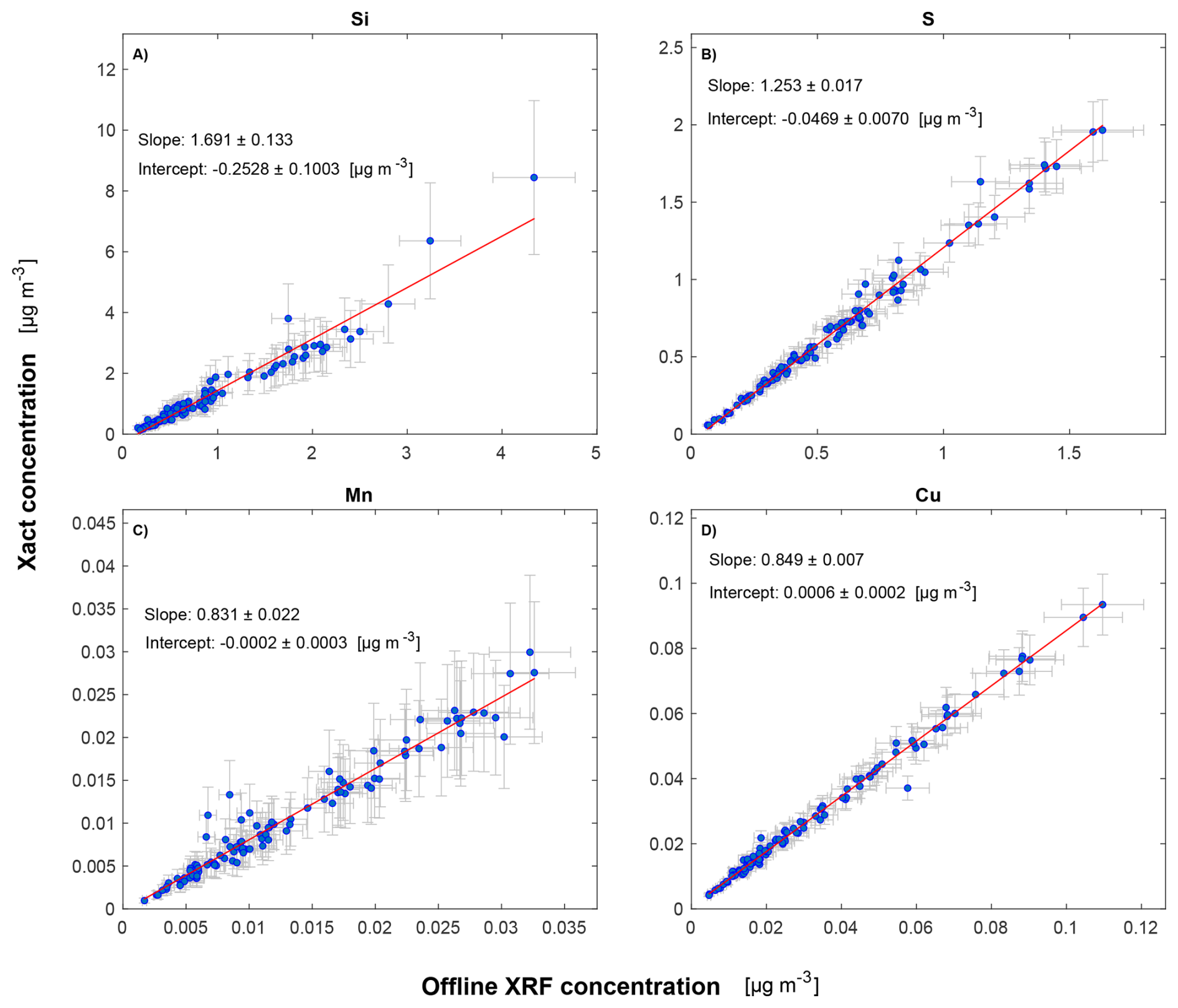Figure 4Scatterplots of the intercomparison between Xact® 625i data and offline ED-XRF data for the elements of Group B: Si, S, Mn, and Cu. The error bars represent the mean experimental uncertainties reported in Table S8.
