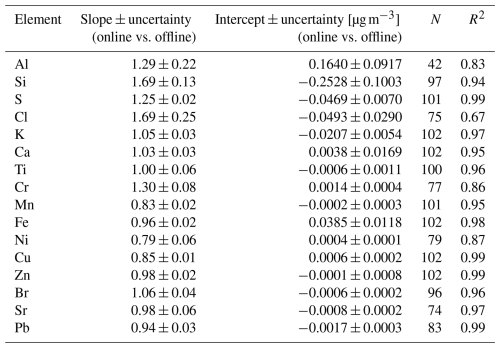 The results of the intercomparison between the PM10 elemental concentrations retrieved offline and online are reported in Table 1. The Deming regression parameters are reported along with their uncertainties and the coefficient of determination of the linear regression; the amount of data (N) considered for the comparison after data reduction is also reported.