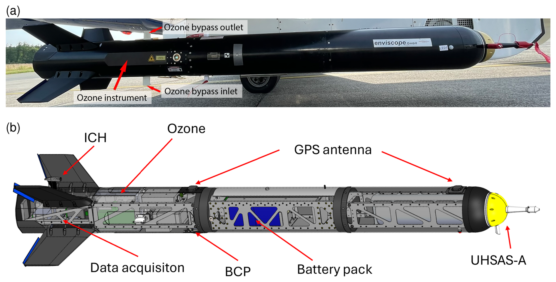 Here, we present a novel development, which builds on previous experiences for a radiation/cirrus payload (Frey et al.2009, 2014; Finger et al.2016; Klingebiel et al.2017). The new setup of the TPC-TOSS (TropoPause Composition TOwed Sensor Shuttle) includes measurements of ozone, GPS information, aerosol size distribution from 95–1000 nm as well as sensors for humidity and temperature, which are operated simultaneously on the Learjet.