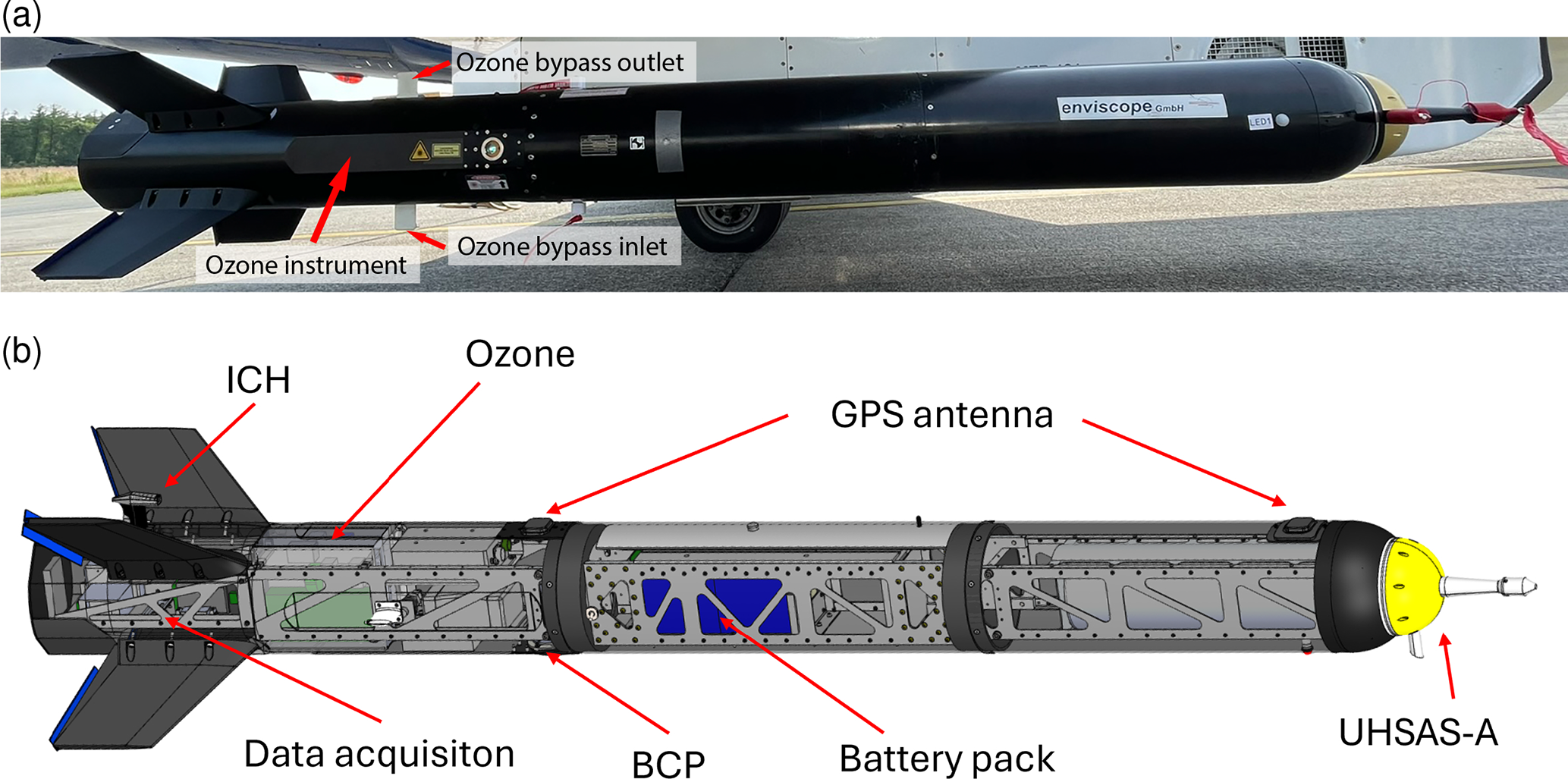 Figure 2(a) TPC-TOSS with ozone bypass inlet and outlet. The ozone instrument is located in the back of the TPC-TOSS. Note that, while attached to the aircraft, the TPC-TOSS is rotated upward by 90 °. (b) Computer-Aided Design (CAD) drawing of the TPC-TOSS including the instrumentation and battery pack.