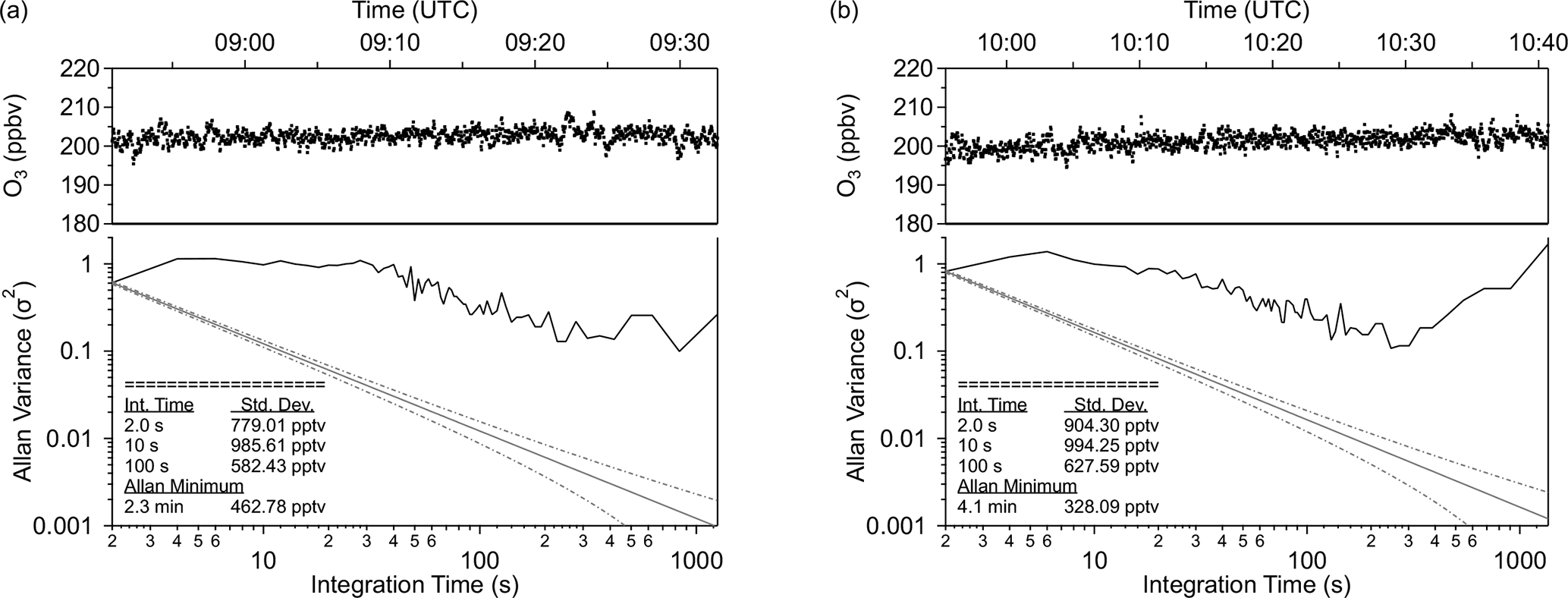 Both ozone instruments were extensively checked and tested prior and during the campaign. Noise and drift (as a measure of stability) under different laboratory conditions and during the field campaign on ground have been checked. To test noise and drift of both instruments we used the Allan variance (Allan1966; Werle2011). Having pure statistical noise (white noise) the Allan variance should decrease with increasing integration time following the black solid line in Fig. 3 (lower panel). Our instruments show a constant or even increasing Allan variance up to integration times of 4–6 s followed by a decrease of the Allan variance until an optimal integration time of 300–500 s where the Allan variance is at minimum. At larger integration times the slow drift starts to dominate leading to increasing Allan variance. Furthermore a significant deviation from the white noise floor (black line) is observed. According to Werle (2011), additional non-white noise components, e.g., flicker noise, could lead to this deviation. A maximum of the Allan variance at an integration time larger than the lowest time resolution (in our case 2 s) corresponds to a low pass filter characteristic. The low pass filter is usually applied in the frequency domain but its effect could also be observed in the time domain. Signal smoothing or damping effects of fast concentration changes would in turn lead to the observed behavior of the Allan variance. As discussed in Sect. 4.4, the output frequency of the ozone instrument is 2 s but the measurement process itself leads to independent data points only every 4 s. Taking into account that the gas exchange time in the tubing system is on the order of 1 s, data points before the Allan variance maximum are to some degree correlated. This is similar to applying a smoothing or running mean of 4–6 s to the ozone data which increases the Allan variance with integration time. After the maximum, the Allan variance further decreases with integration time but deviates from the black solid line. For the “Knuffi” instrument a significant decrease is observed only after 30 s. For both instruments we observed slow irregular changes of the cell pressure caused by irregular changes of pump capacity of the small internal membrane pumps. These variations most probably add non statistical noise components (flicker noise) to the Allan Variance expressed as the observed deviation from the black line (Werle2011). As these cell pressure variations are stronger for the “Knuffi” instrument, the Allan variance for this instrument is stronger affected during the first 20 to 30 s compared to the TPC-TOSS instrument. Similar results for the Allan variance with an Allan maximum around 4 s are reported by Moormann et al. (2025), who operated the same type of instrument on a drone, thereby confirming our laboratory and field tests. Based on these Allan variance analysis the noise of both instruments under laboratory conditions amounts to 1 ppbv (1σ) for 2 s data at a mixing ratio of 200 ppbv. The quantification of the drift of both instruments as a measure of stability is done in the following section.