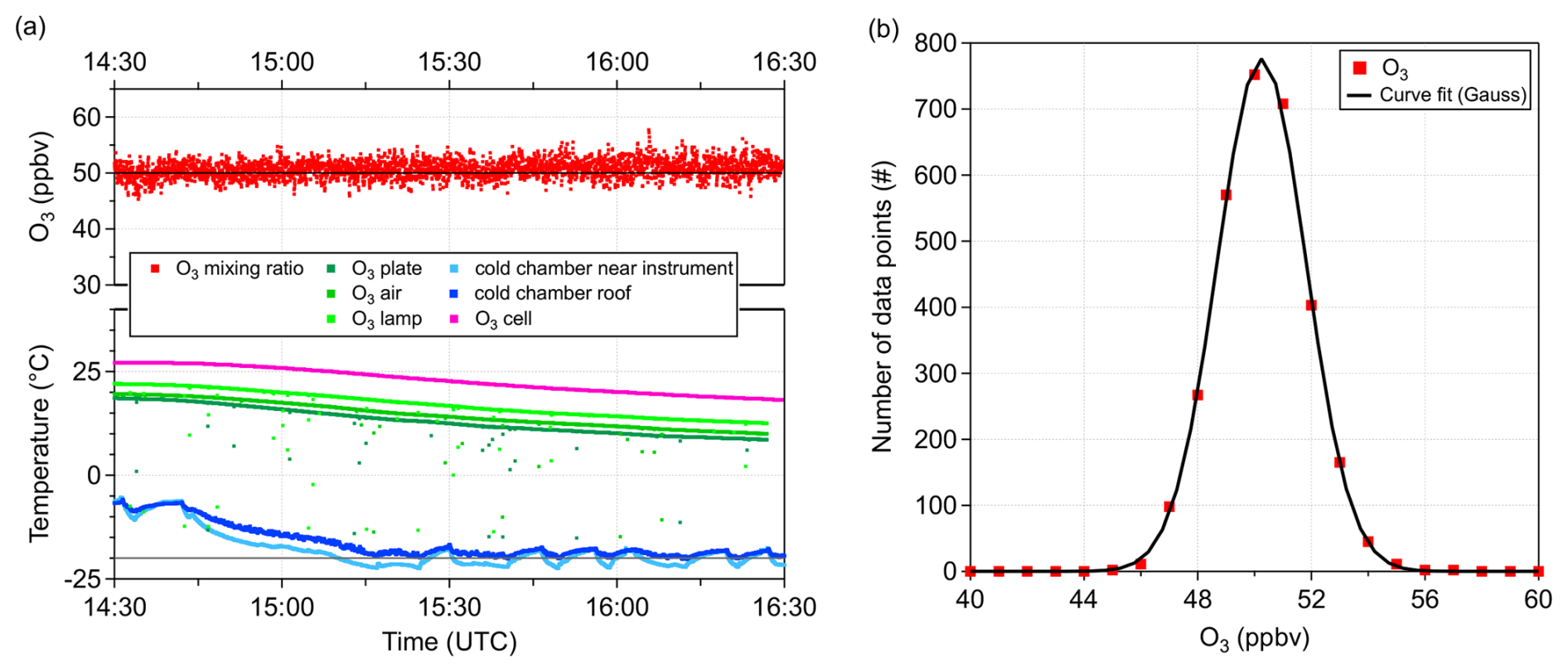 Figure 5Temperature dependence test of the ozone monitor within a cold chamber. (a) ozone mixing ratio is shown in red. The cell temperature within the ozone monitor is shown in pink and further internal temperature measurements are shown in green colours. Two sensors measuring the air temperatures at different positions inside the cold chamber are shown in blue colours. The dark blue measurement is nearby the ozone monitor and the light blue sensor was located below the roof of the cold chamber. The black line in the upper panel shows the target ozone mixing ratio of 50 ppbv, the grey line in the lower panel shows the target temperature of −20°C of the cold chamber. (b) histogram of ozone data during the temperature test. Red dots show the distribution of ozone measurements. The black line shows a gaussian curve fit to the measured ozone distribution.