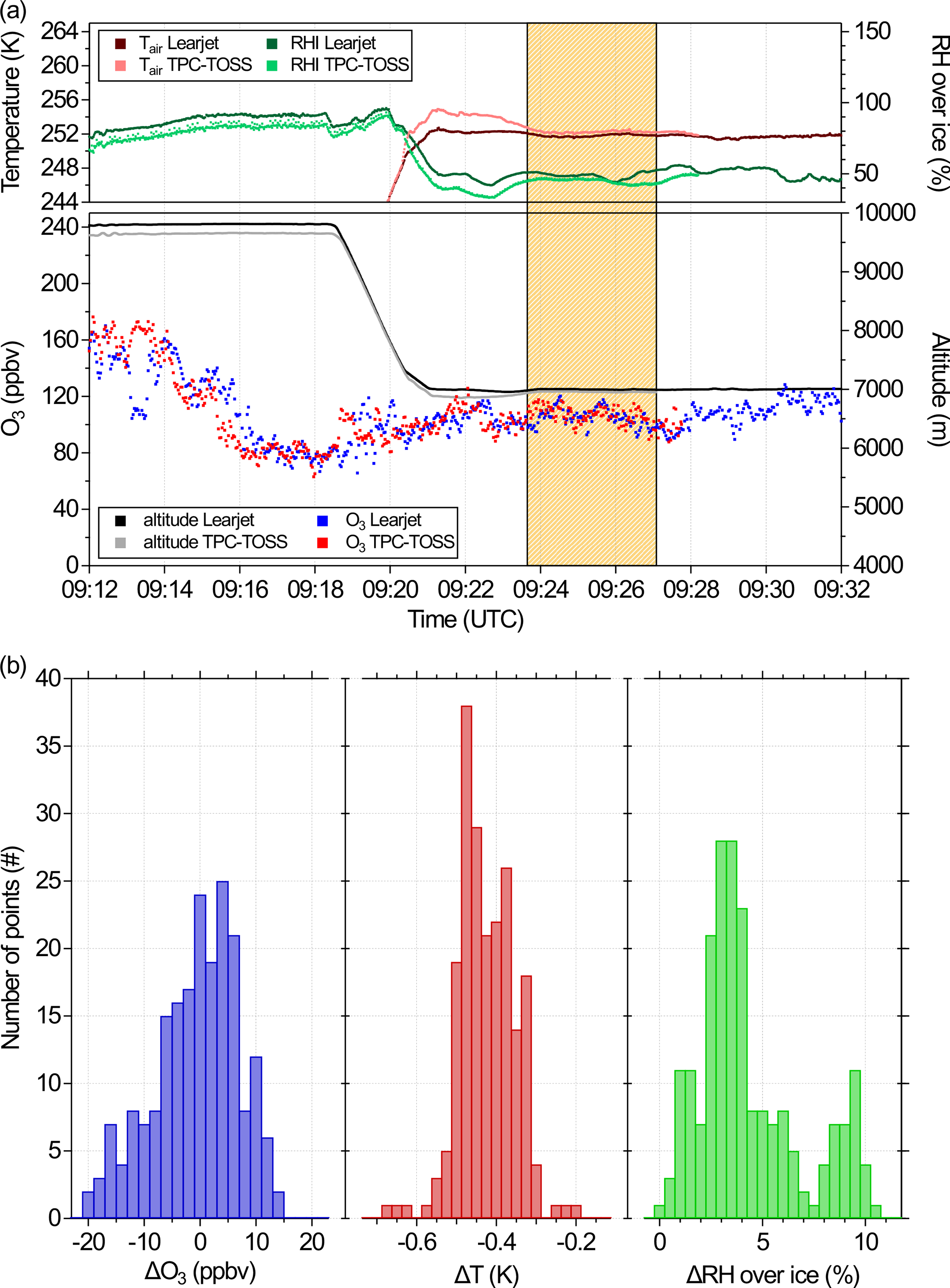 Figure 8Co-located performance test in-flight during research flight F10 on 20 June 2024. (a) Time series of ozone measurements and GPS altitude (lower panel) from Learjet (ozone: red, altitude: black) and TPC-TOSS (ozone: blue, altitude: grey) as well as measured outside air temperatures (red colours) and relative humidity over ice (RHI) (green colours) in the upper panel. The dark yellow shaded area shows a time interval when the TPC-TOSS was released at minimum safe rope distance (200 ft  61 m) for around four minutes. At that time the vertical distance between Learjet and TPC-TOSS was around 43 m. (b) histograms of the difference between Learjet and TPC-TOSS data within the yellow shaded time interval.