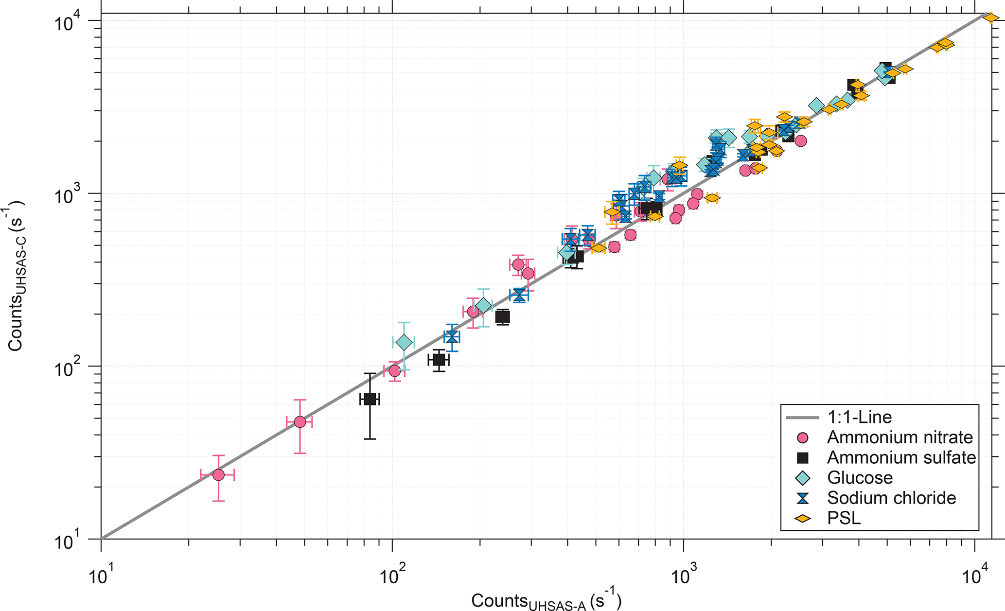 Furthermore, we investigated the counting efficiency of both instruments. For this, we used the same measurements as for the size calibration and compared the total count number, by adding the counts from all size bins. Figure 11 shows the median values for one minute averages of both instruments, for all particle types measured during the laboratory characterization. The data from both instruments show good agreement and are distributed around the 1:1 line. Figure 12 shows the ratio of the median values as a function of size. Here we can see that in a size range between about 300 and 500 nm, the UHSAS-A showed less particle counts than the UHSAS-C, but showed slightly higher particle counts around 100–200 nm. The discrepancies in the range between 300 and 500 nm are unexpected, and there is no clear explanation for them. It may be a combination of imperfect gain calibration and slight laser misalignment causing the undercounting of particles by the UHSAS-A.