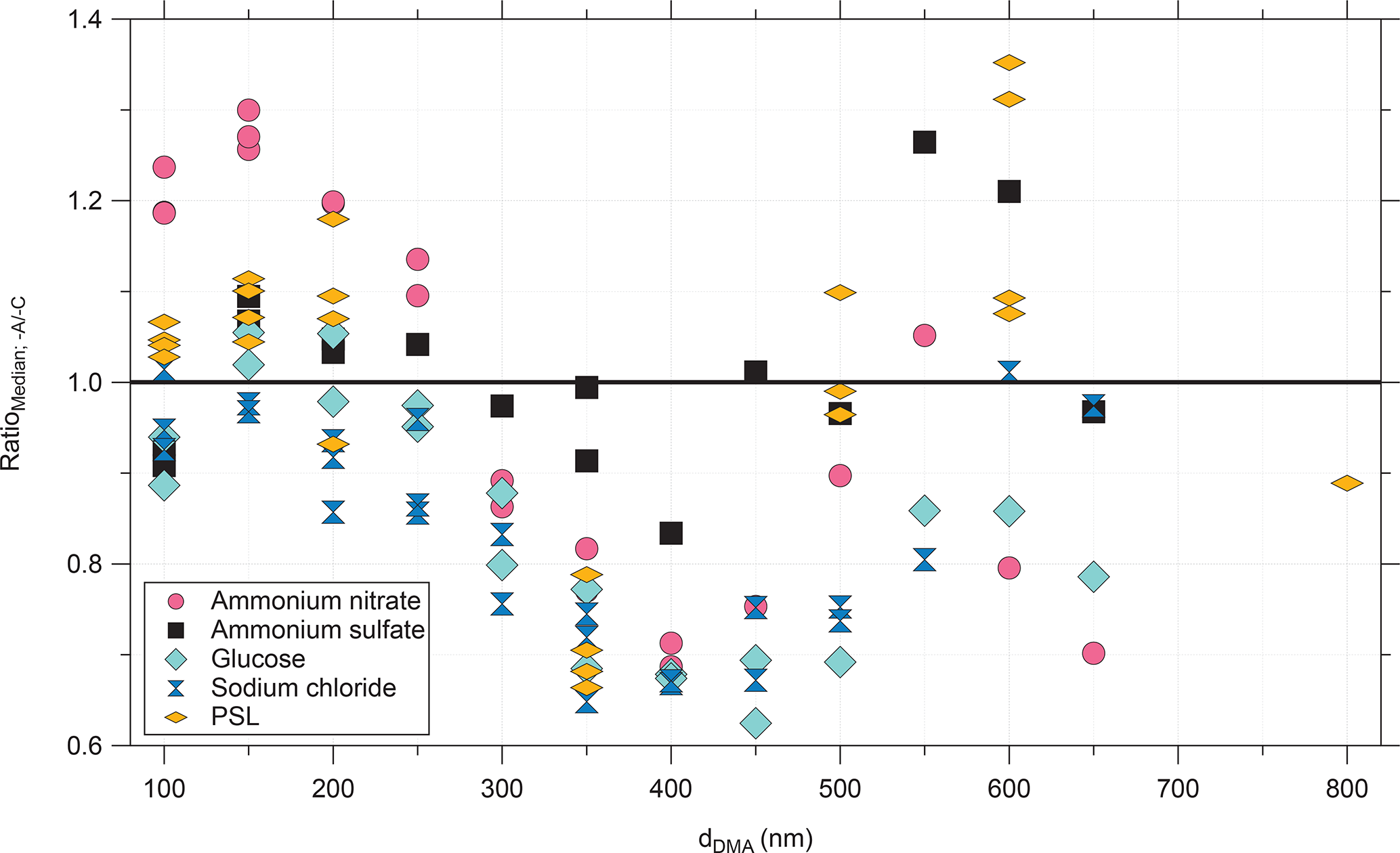 Figure 12Ratio between the median counts of UHSAS-A divided by the median counts of the UHSAS-C. The colours and symbols indicate the different aerosol species; ammonium nitrate (pink, circle), ammonium sulfate (black, square), glucose (bright blue, tilted square) sodium chloride (blue, hourglass) and PSL (orange, diamond).