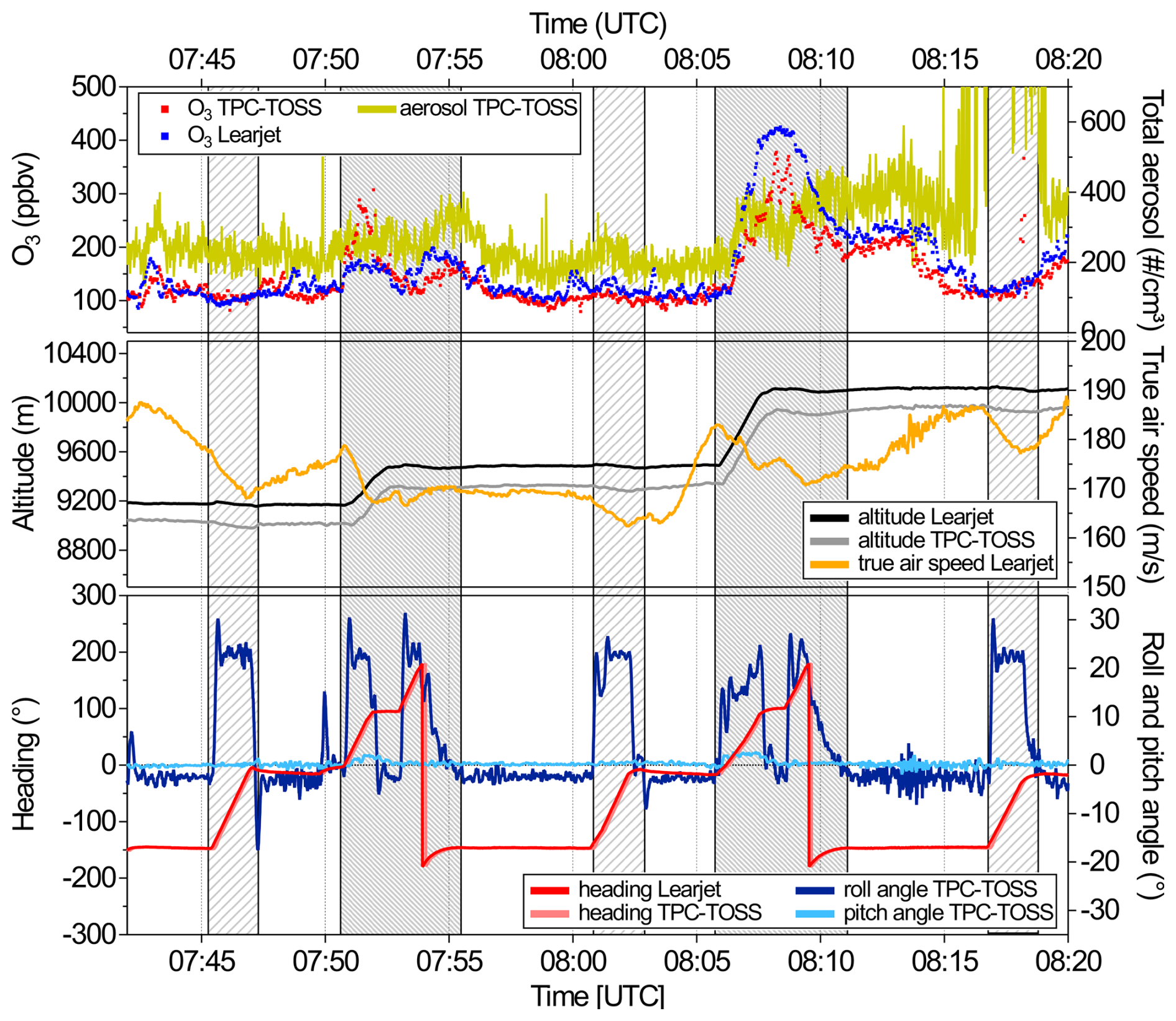 To analyze co-located measurements on two platforms with respect to gradients of aerosol, trace species and meteorological parameters one requires a precise definition of the position of the individual platform and/or the relative position between both, Learjet and TPC-TOSS. We used a high performance tactical grade GNSS-Aided Inertial Navigation System (GNSS/INS) which uses MEMS (Micro-Electro-Mechanical Systems) inertial sensors in combination with dual multi-frequency GNSS receivers. The used 3DM-GQ7 (MicroStrain company) consists of a 3-axis accelerometer, 3-axis gyroscope, 3-axis magnetometer, a pressure altimeter and a dual GNSS receiver. The system performance given as uncertainty (1σ) of the most important parameters within the operating temperature range of −40–85 °C is based on manufacturer information as follows: The uncertainty of horizontal and vertical position amounts to 1.25 and 2 m, respectively. With respect to flight attitude, roll and pitch angles could be derived with an uncertainty of 0.05° while the error for the heading amounts to 0.25°. The error of the measured velocity is 0.05 m s−1. This sensor was installed on both the Learjet and the TPC-TOSS to get consistent information on position and attitude of the respective platform. Two GPS antennas were installed on each platform located at a horizontal distance of 198 cm on the Learjet and 148 cm on the TPC-TOSS. The use of two antennas (L1 band at 1600 MHz and L2 band at 1200 MHz) increases the redundancy of the GPS positioning in case one antenna experiences reception issues. Simultaneously, it enables improved heading determination based on the relative position of the two antennas, with the associated uncertainty stated above. Position and attitude information were recorded at a resolution of 1 Hz. In addition, acceleration data were available at 100 Hz, providing insight into turbulent flight conditions experienced by the Learjet and TPC-TOSS.