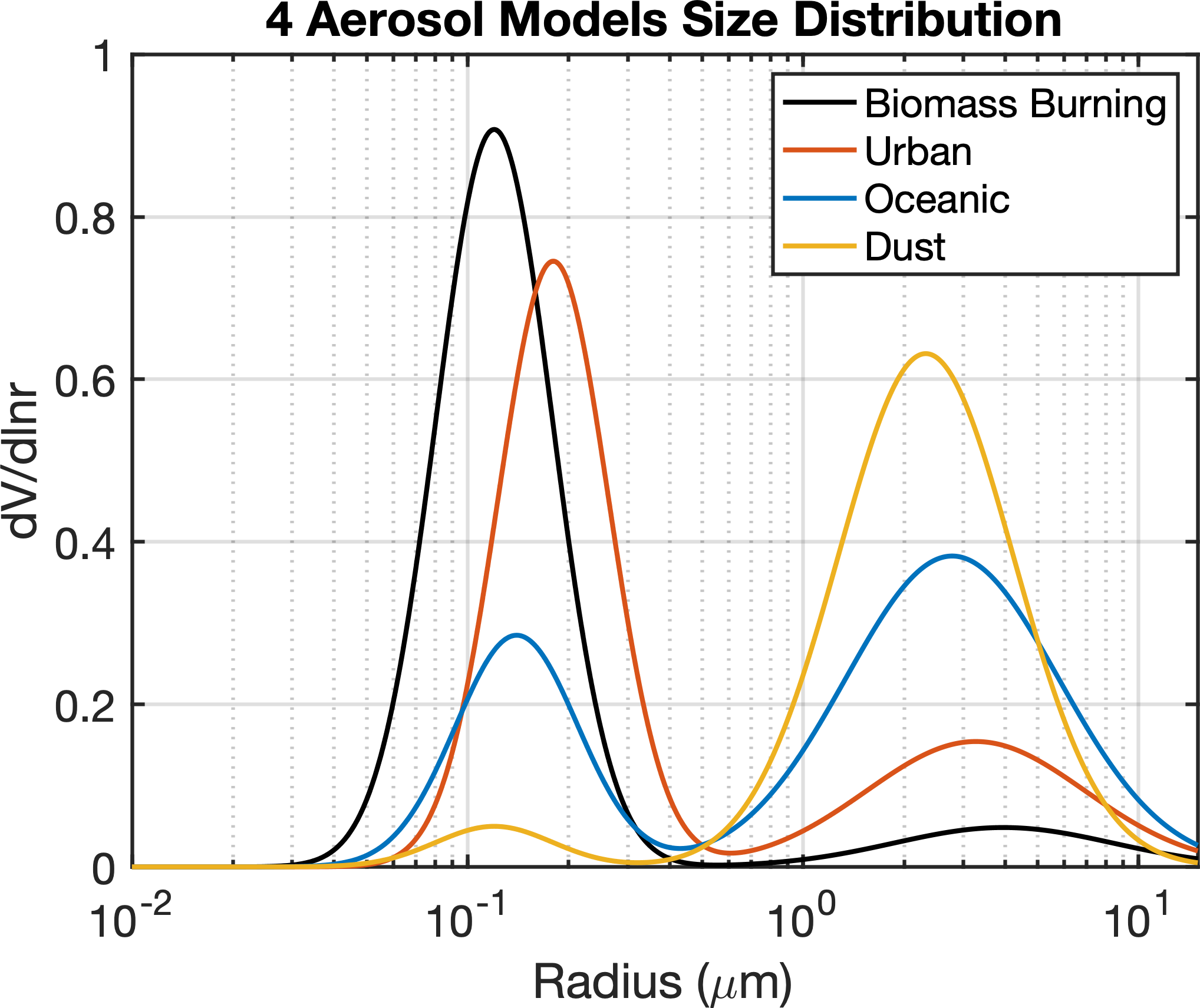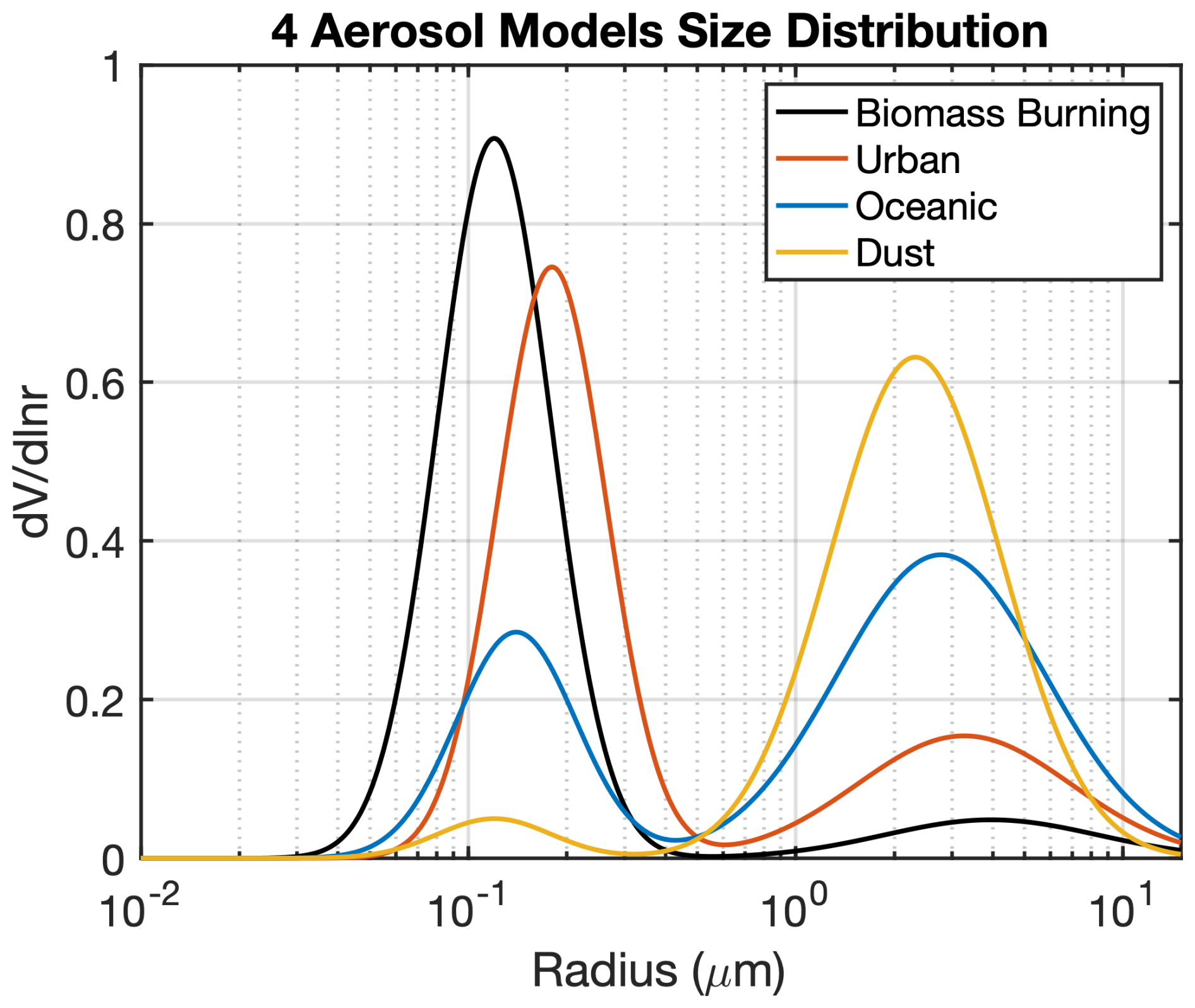 Figure 1Aerosol size distributions for four aerosol components used in the AHI/GRASP retrieval: Biomass burning, Urban, Oceanic and Dust.