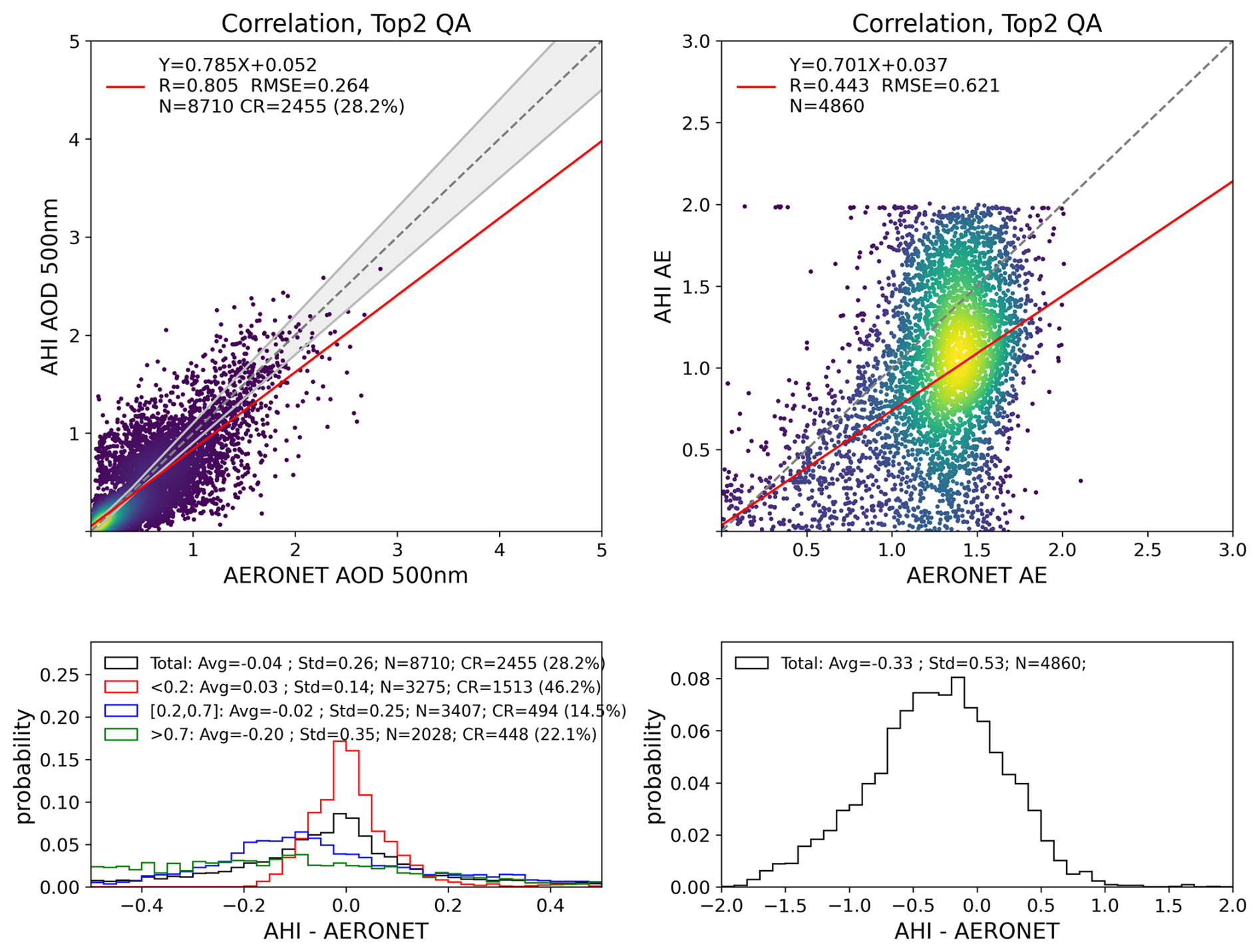In comparison of AHI/JAXA AOD at 500 nm with AERONET values, a correlation coefficient of 0.81, RMSE of 0.26 and the overall mean bias of −0.04 were obtained and 28.2 % of data satisfied the Global Climate Observing System (GCOS) (GCOS-245, 2022) requirements (0.04 or 10 %). Note that the original GCOS requirements are defined as 0.03 or 10 %, while the uncertainty of AERONET AOD is expected to be 0.01 (Popp et al., 2016), thus the increase of absolute threshold values (Chen et al., 2020). However, the AOD is significantly underestimated for high aerosol loading with a mean bias of −0.2 for AOD>0.7. The AE retrieval from AHI/JAXA shows reasonable results with correlation coefficient of 0.44 and RMSE of 0.62 with AERONET values.