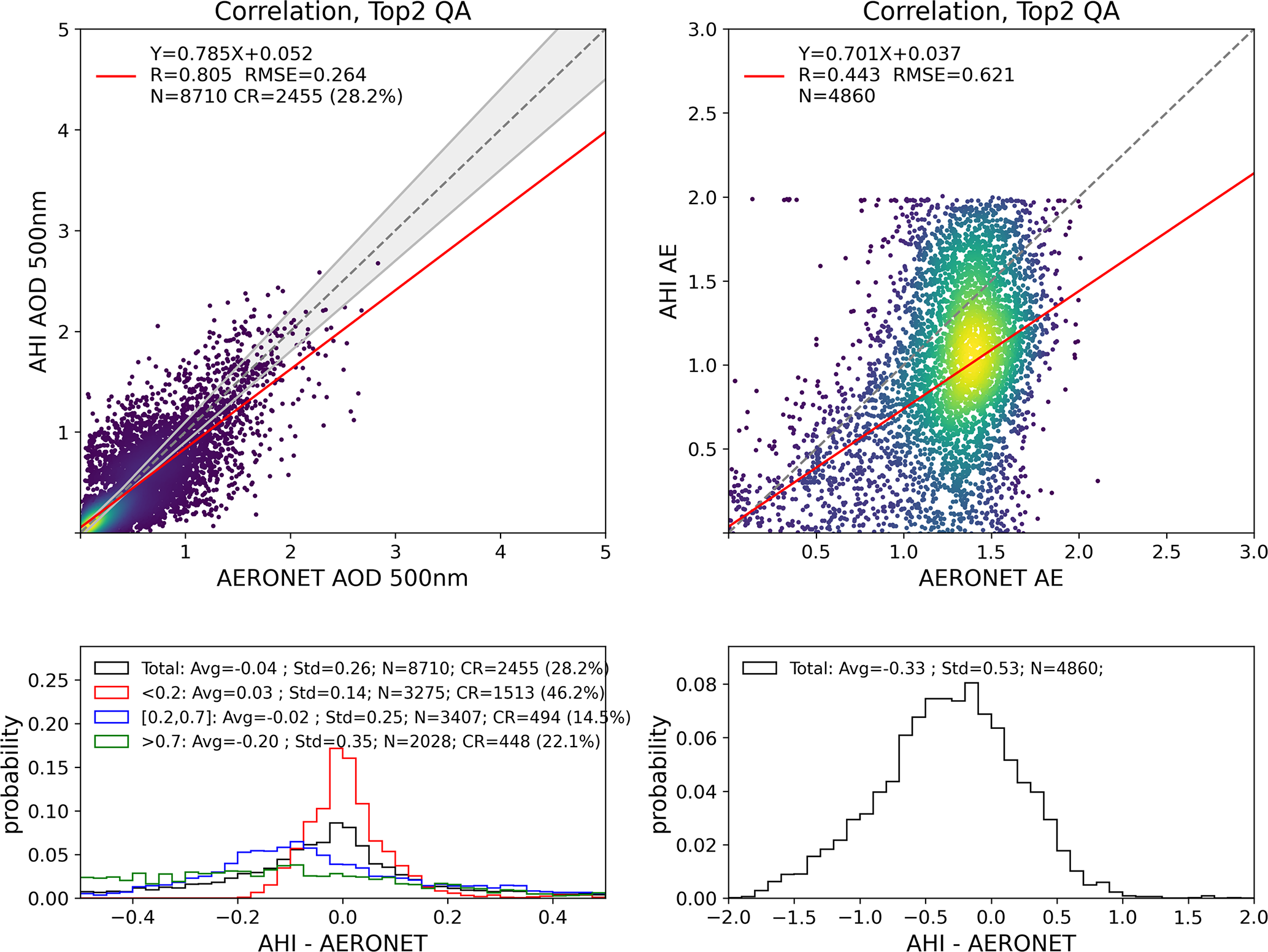 Figure 2Validation of AHI/JAXA operational products against AERONET measurements for AOD at 500 nm and Angstrom exponent (AHI at 400–600 nm, AERONET at 440–870 nm for the year 2018). The 1:1 reference lines and linear regression lines are indicated by grey dashed lines and red lines. The GCOS requirements for AOD: max (10 %; 0.04) are indicated by the grey envelopes. The probability density functions of biases (AHI/JAXA–AERONET) are present in the lower panels for different AOD conditions: the black, red, blue and green solid lines represent all AOD, AOD<0.2, and AOD>0.7, respectively.