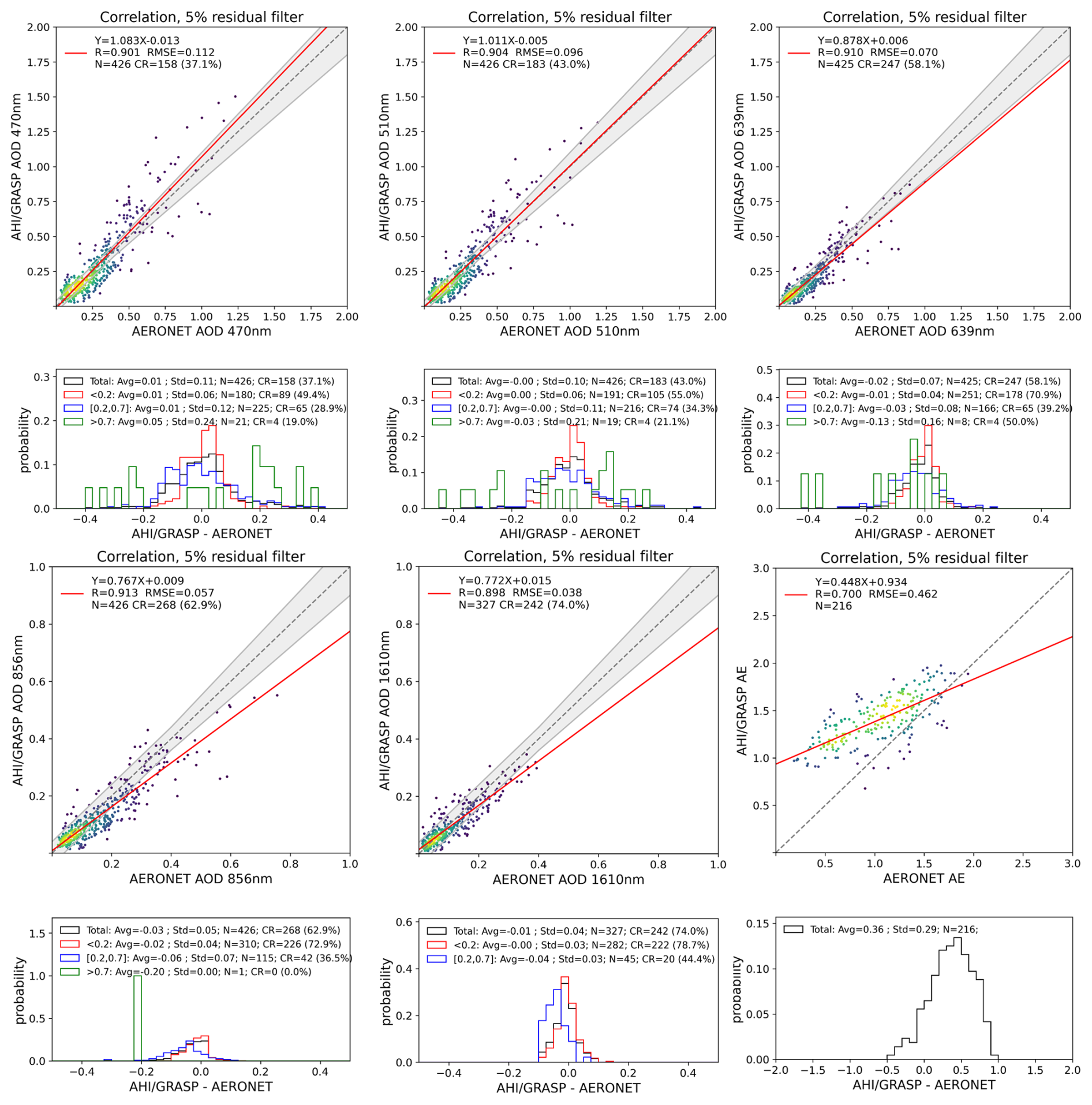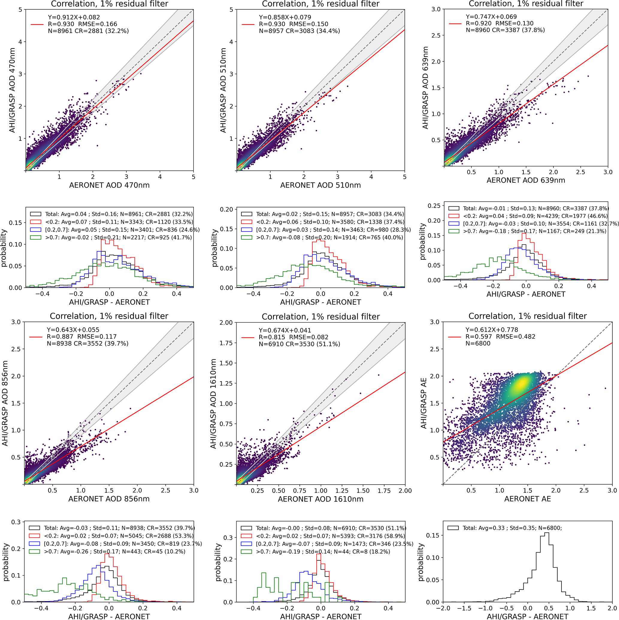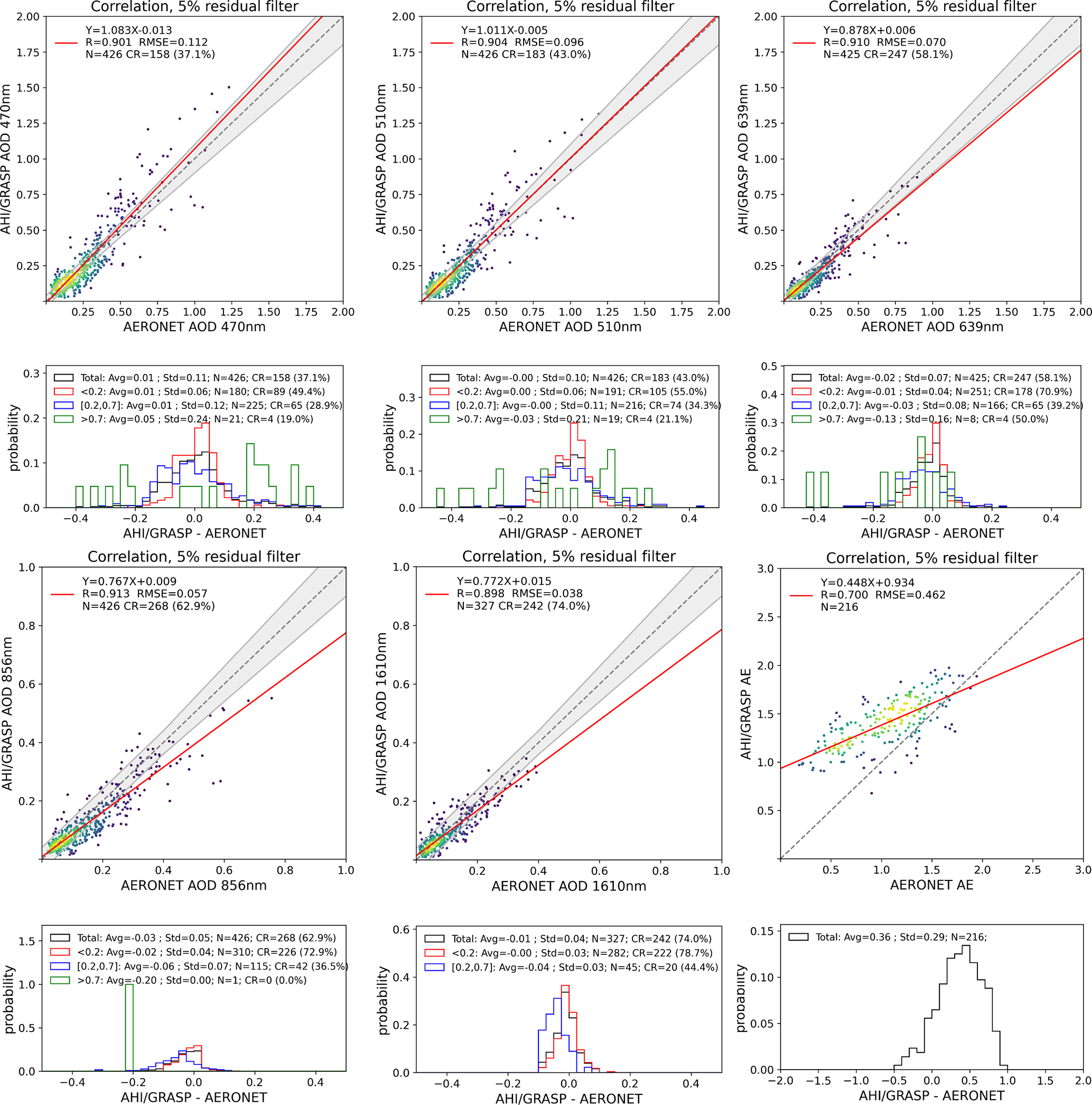 To facilitate the comparison between the AERONET and AHI/GRASP retrieved AOD, the AERONET AOD values are interpolated onto AHI wavelengths at 470, 510, 639, 856, 1610 nm using the AERONET Angstrom Exponent at 440–870 nm. The validation scatterplots of the AHI/JAXA and AHI/GRASP retrievals using AERONET measurements as well as the probability density functions of biases are shown in Figs. 2 and 3.