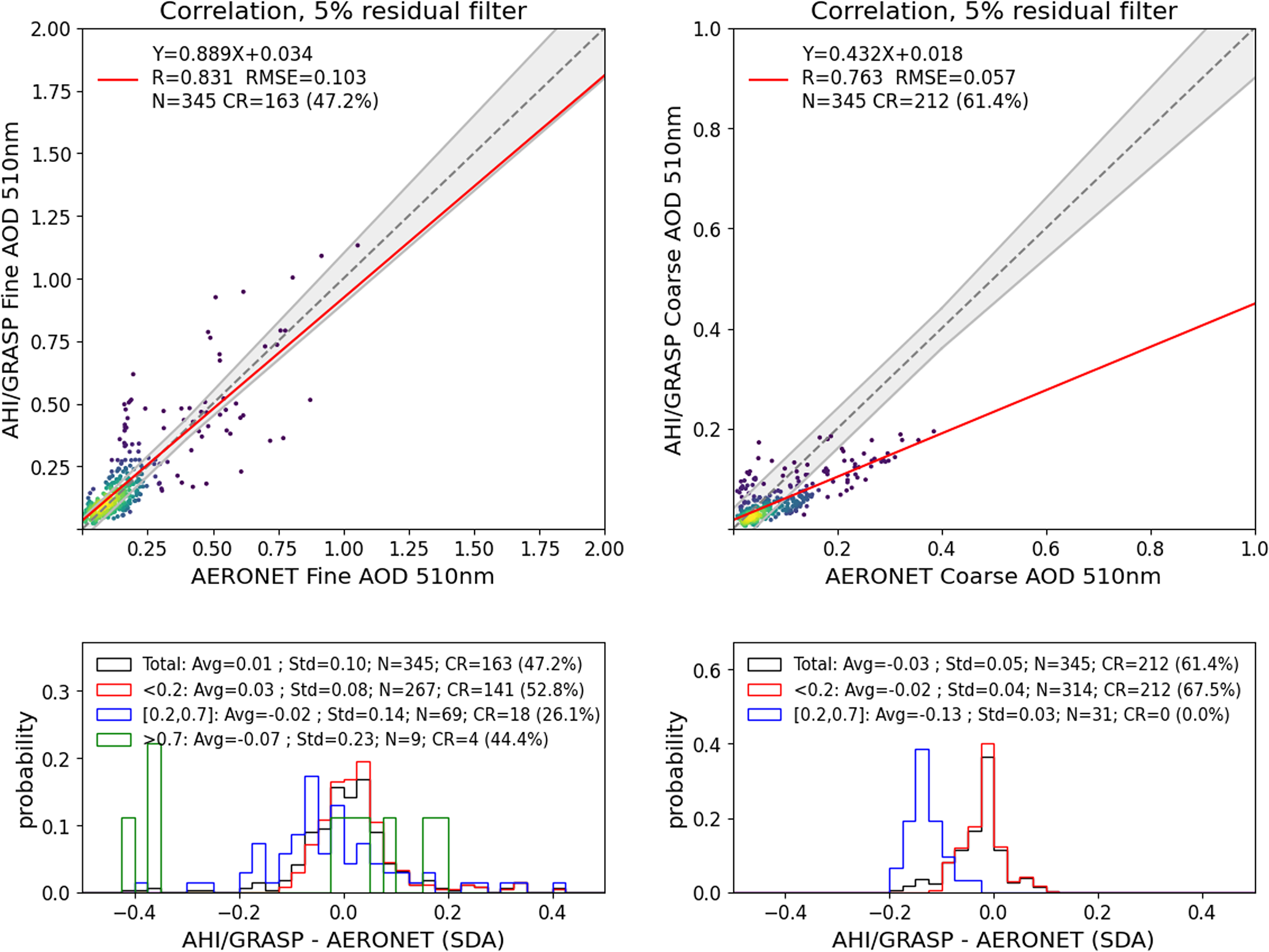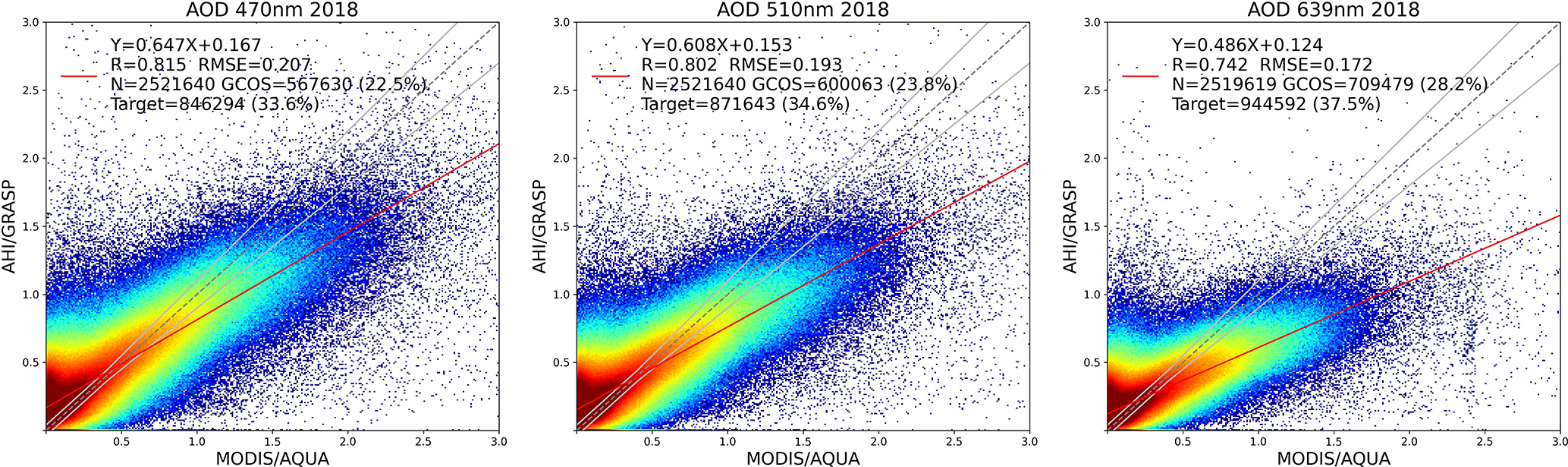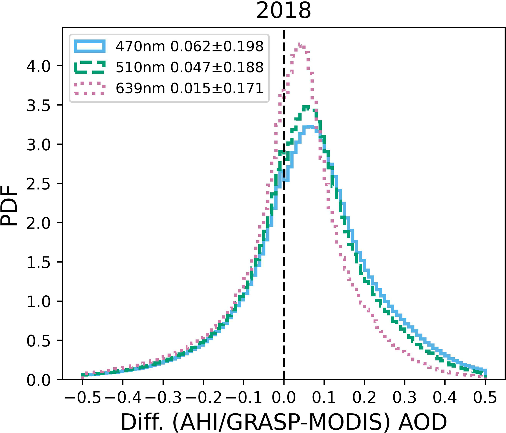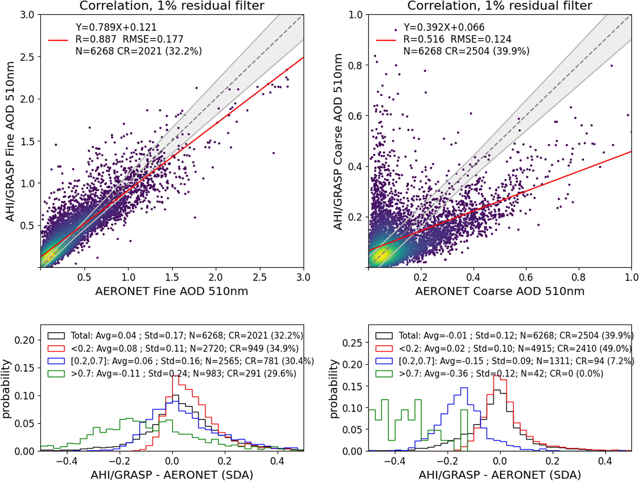 To facilitate the comparison between the AERONET and AHI/GRASP retrieved AOD, the AERONET AOD values are interpolated onto AHI wavelengths at 470, 510, 639, 856, 1610 nm using the AERONET Angstrom Exponent at 440–870 nm. The validation scatterplots of the AHI/JAXA and AHI/GRASP retrievals using AERONET measurements as well as the probability density functions of biases are shown in Figs. 2 and 3.