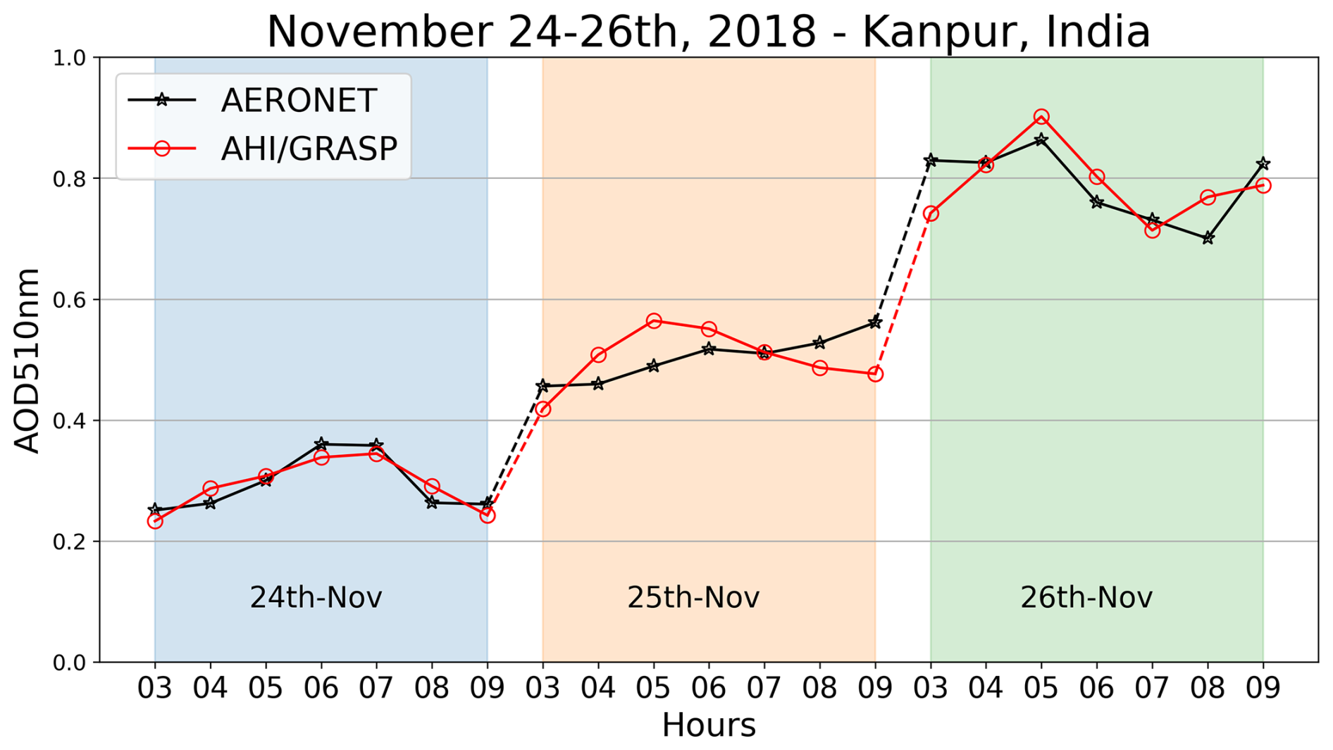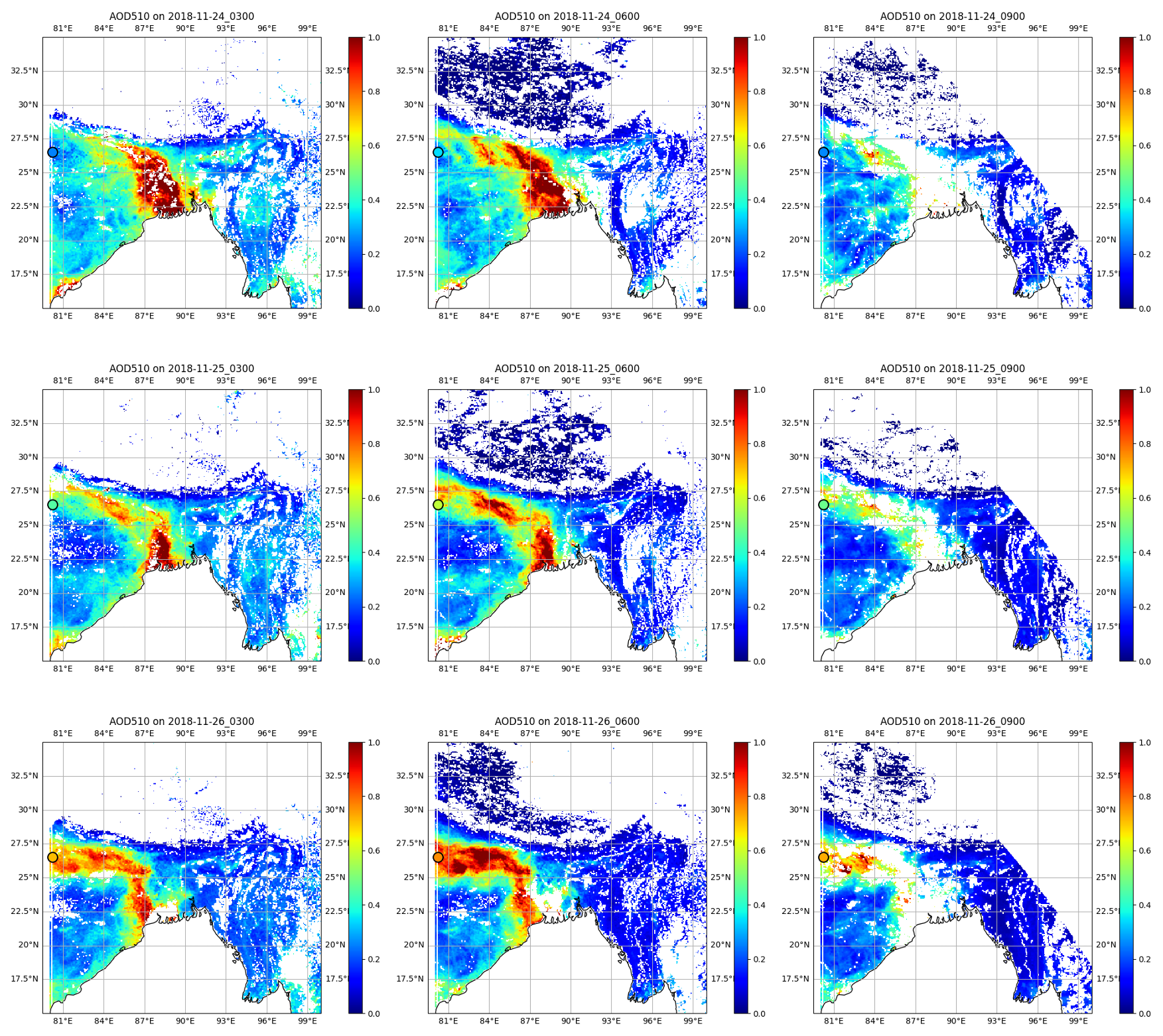 Figure 8AHI/GRASP AOD510 nm distribution for the pollution event during 24–26 November 2018. The AERONET site Kanpur (India) is marked with a black circle (on the left edge of the map).