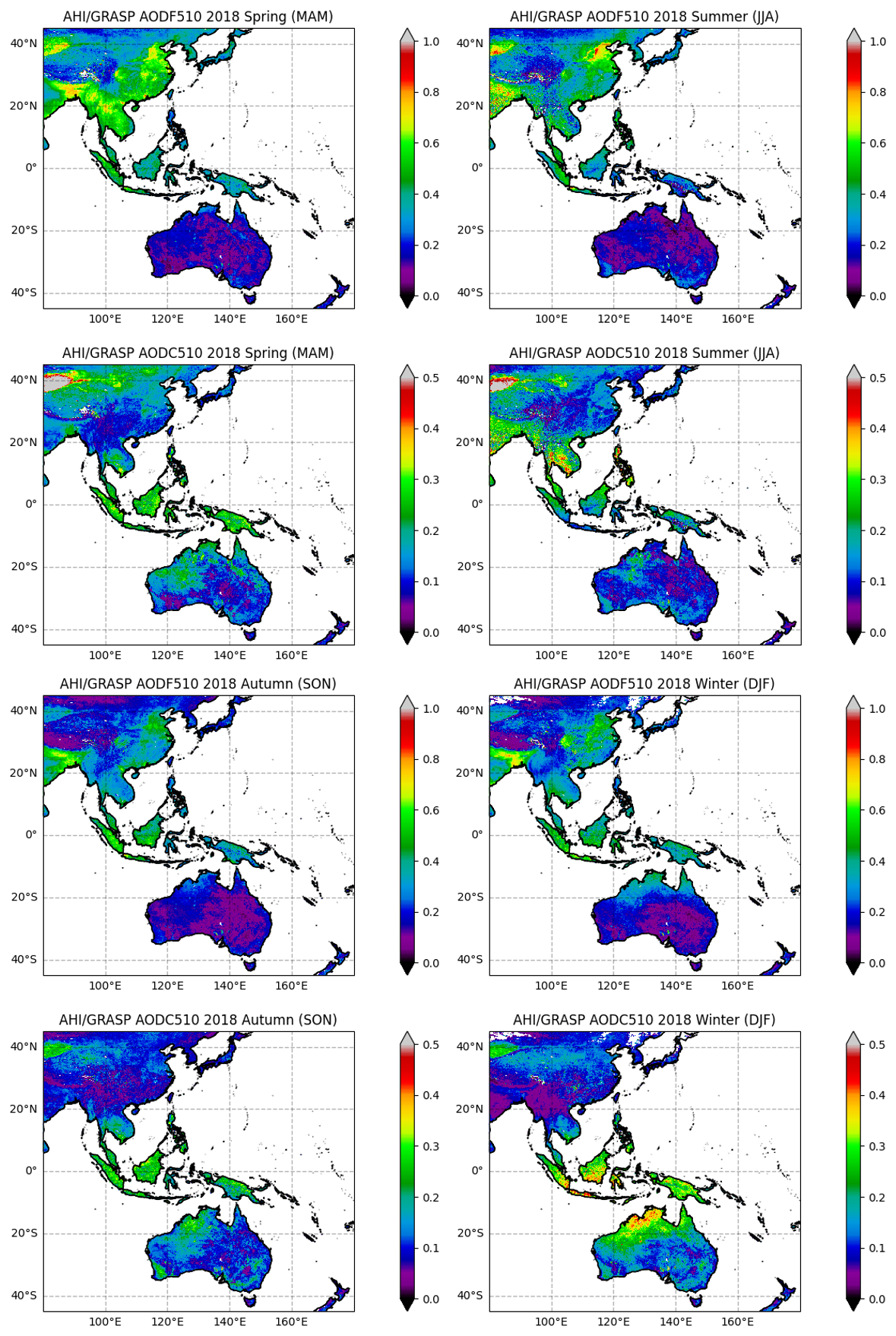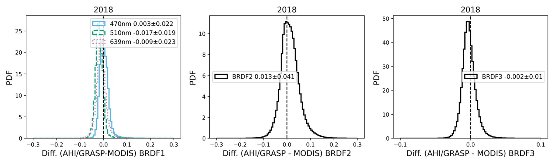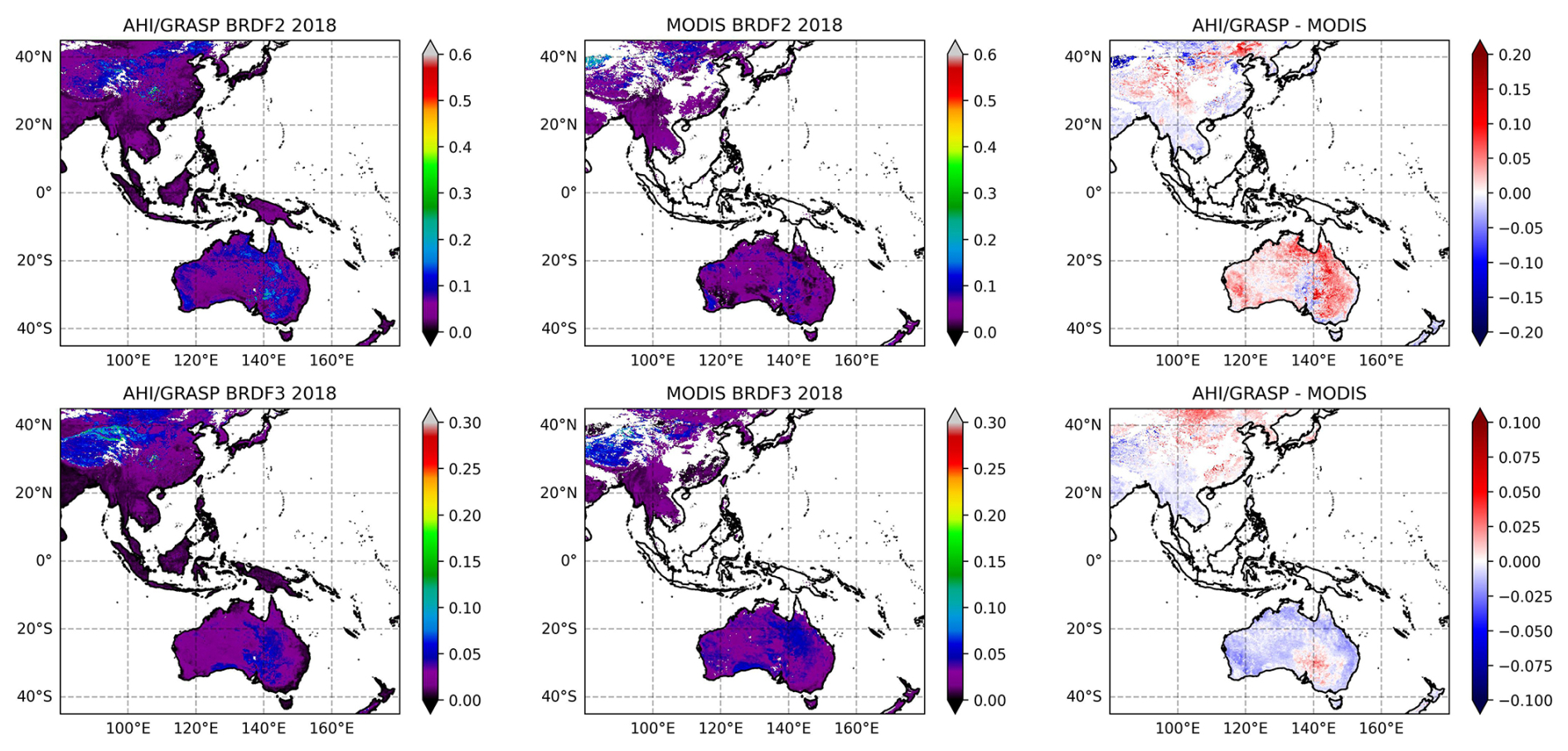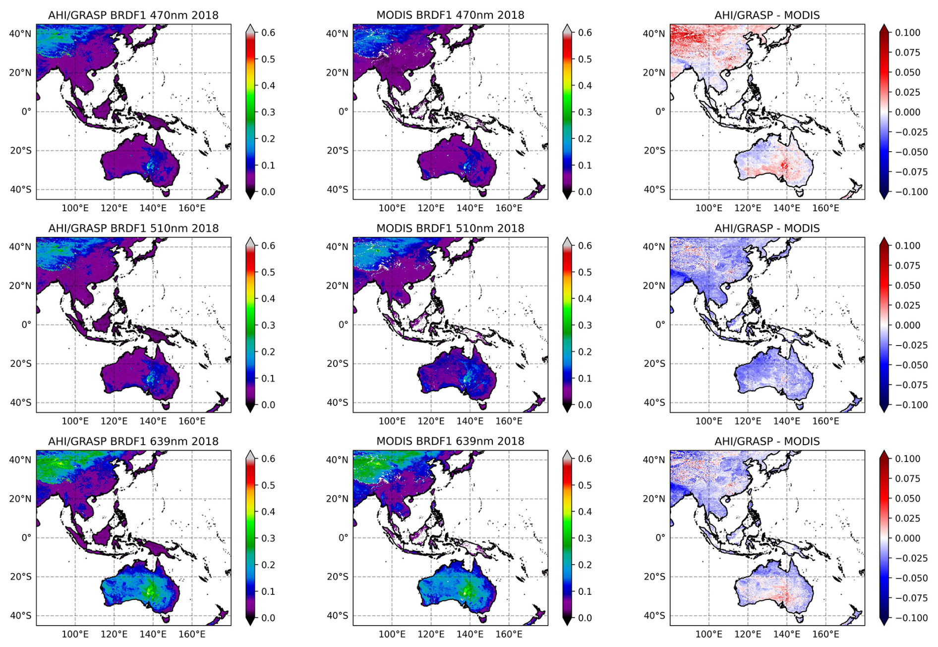 Thus, in this study, we explored the advantages of the GRASP to retrieve aerosol products from AHI/Himawari-8 level 1b data along with the surface properties instead of relying on the pre-calculated surface reflectance. The obtained aerosol products of AHI/GRASP were validated against ground measurements from AERONET observations, while the surface properties were compared with the surface BRDF and Albedo products MCD43C1 from MODIS (Schaaf and Wang, 2015).