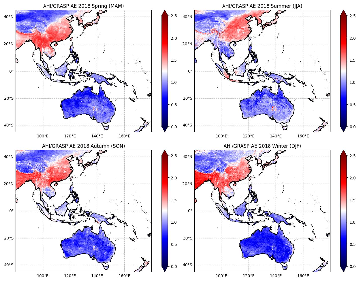 The operational JAXA AHI/Himawari-8 Level 2 aerosol product was generated based on the retrieval algorithm developed by Fukuda and Yoshida (Fukuda et al., 2013; Yoshida et al., 2018) in four different versions: V1.0 (July 2015–September 2018), V2.0 (July 2015–August 2018), V2.1 (July 2015–present), and V3.0 (January 2020–present) (https://www.eorc.jaxa.jp/ptree/documents/Himawari_Monitor_Aerosol_Product_v8a.pdf, last access: November 2025). Each version provides continuous improvements based on its predecessor, for example, compared to V1.0 algorithm, the V2.0 updates the aerosol model (Omar et al., 2005; Sayer et al., 2012), the AOD range was extended from 2.0 to 5.0, the objective function was updated based on the optimal estimation method (Rodgers, 2000), and the surface reflectance estimation was updated based on the method of Fukuda et al. (2013). In V2.1, the iteration of optical estimation was improved and extra QA flag (turbid water) was implemented (Gao et al., 2021). In the current study, which uses data of 2018, the V2.1 Level 2 aerosol products are used for comparison. The operational AHI aerosol retrieval algorithm utilizes the second-minimum reflectance after Rayleigh scattering correction within 1 month as the surface reflectance and the AOD and aerosol model are calculated and chosen by minimizing the objective function of the observed and simulated TOA (top of atmosphere) reflectance. The operational aerosol product provides aerosol optical depth at 500 nm (AOD500 nm) at four confidence levels (very good; good; marginal and no confidence) together with its uncertainty, Angstrom Exponent (AE 400–600 nm), Quality Assurance Flags (QA_Flag), etc.