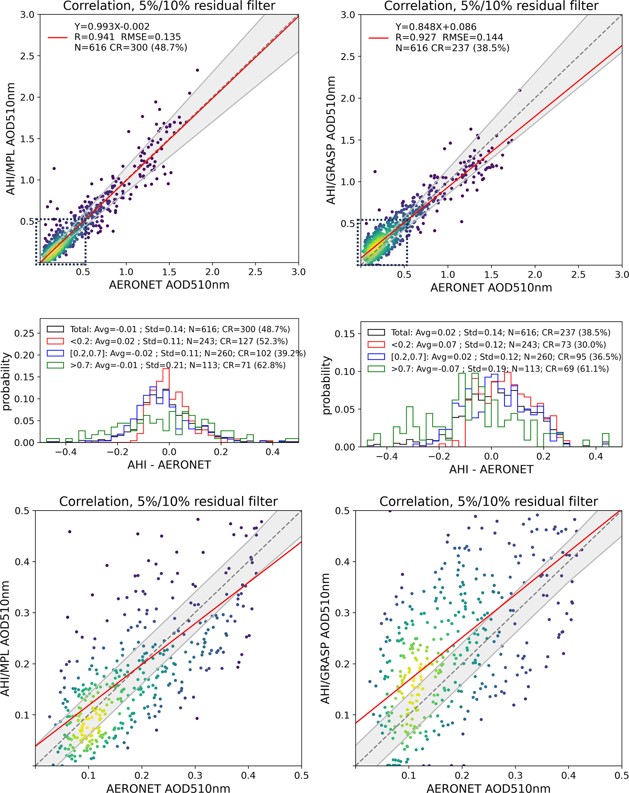 Compared with the AHI/GRASP retrieval alone, the accuracy of AOD is further improved by the synergistic retrieval of AHI+MPL/GRASP, and the improvement is most significant for the low AOD conditions: for AOD<0.2, the average deviation decreases from 0.07 to 0.02, and the data satisfying the GCOS requirement increases from 23.5 % to 42.0 %;