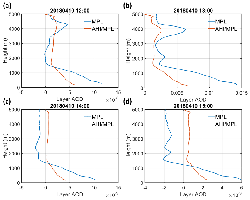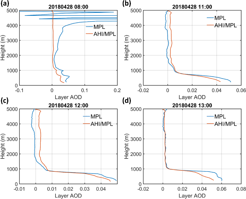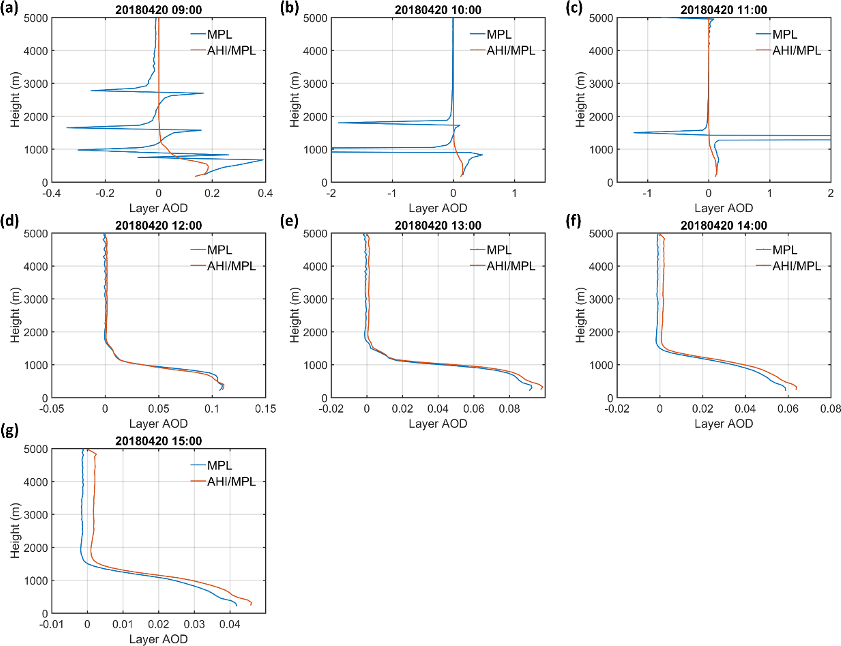 The common way of solving lidar equation to invert the aerosol vertical profile from MPL requires other ground-based observations at the same location as constraints, for example, the Fernald method discussed above requires the AOD measurements from AERONET to calculate the lidar ratio, and the AERONET AOD is used as the constraints for the inversion. From the results above, we can see that the synergistic retrieval of MPL and geostationary satellite observations such as AHI/Himawari-8 could also provide reasonable aerosol profiles while there are no coincident sun-photometer measurements with the lidar observations.