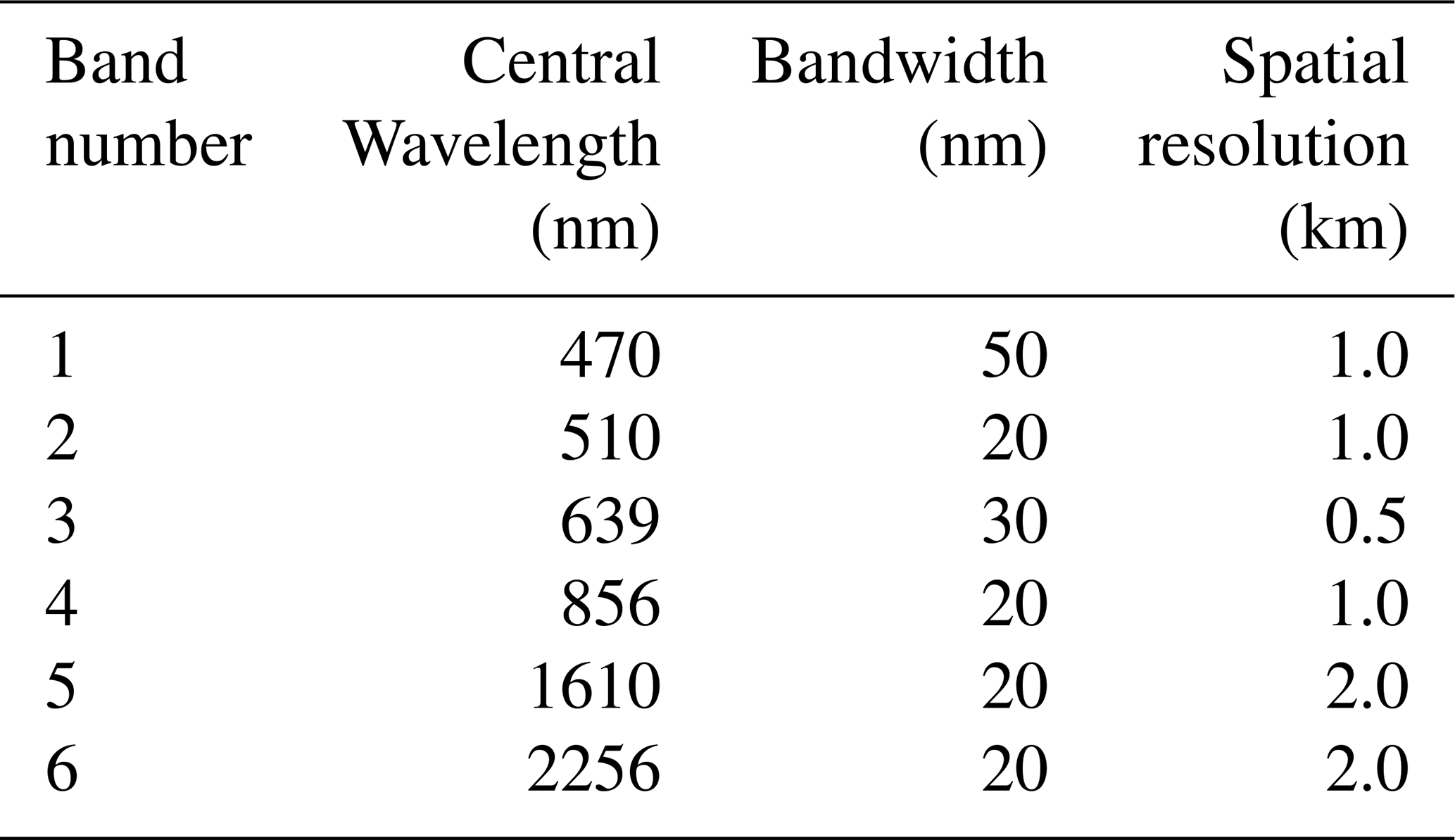 Himawari-8 is a next-generation geostationary satellite launched by the Japan Meteorological Agency (JMA) on 7 October 2014, and started operation on 7 July 2015 (Bessho et al., 2016). The AHI is similar to the Advanced Baseline Imager (ABI) of the U.S. GOES-R series of satellites, with 16 wavelengths from visible to infrared (0.47–13.3 µm) and 0.5/1 km resolution in the visible band and 2 km resolution in the infrared band (Bessho et al., 2016). The AHI mainly covers the Asia-Pacific region (60° S–60° N, 80–160° E) with an observation frequency of every 10 min for full disk and up to 2.5 min for specific regions and targets, providing a great advantage for monitoring the daily changes of atmospheric, surface and oceanic properties in the covered region (https://www.data.jma.go.jp/mscweb/en/product/library_data, last access: November 2025). Since 31 August 2016, AHI/Himawari-8 data have been released through JAXA's P-Tree system (https://www.eorc.jaxa.jp/ptree/index.html, last access: November 2025), including the Himawari-8 Standard Data (HSD), which is the Level 1 data in NetCDF4 format with a resolution of 2/5 km, and Level 2 and 3 products with a resolution of 2/5 km for aerosols, clouds, sea surface temperature, shortwave radiation, chlorophyll-a, wildfires, etc.