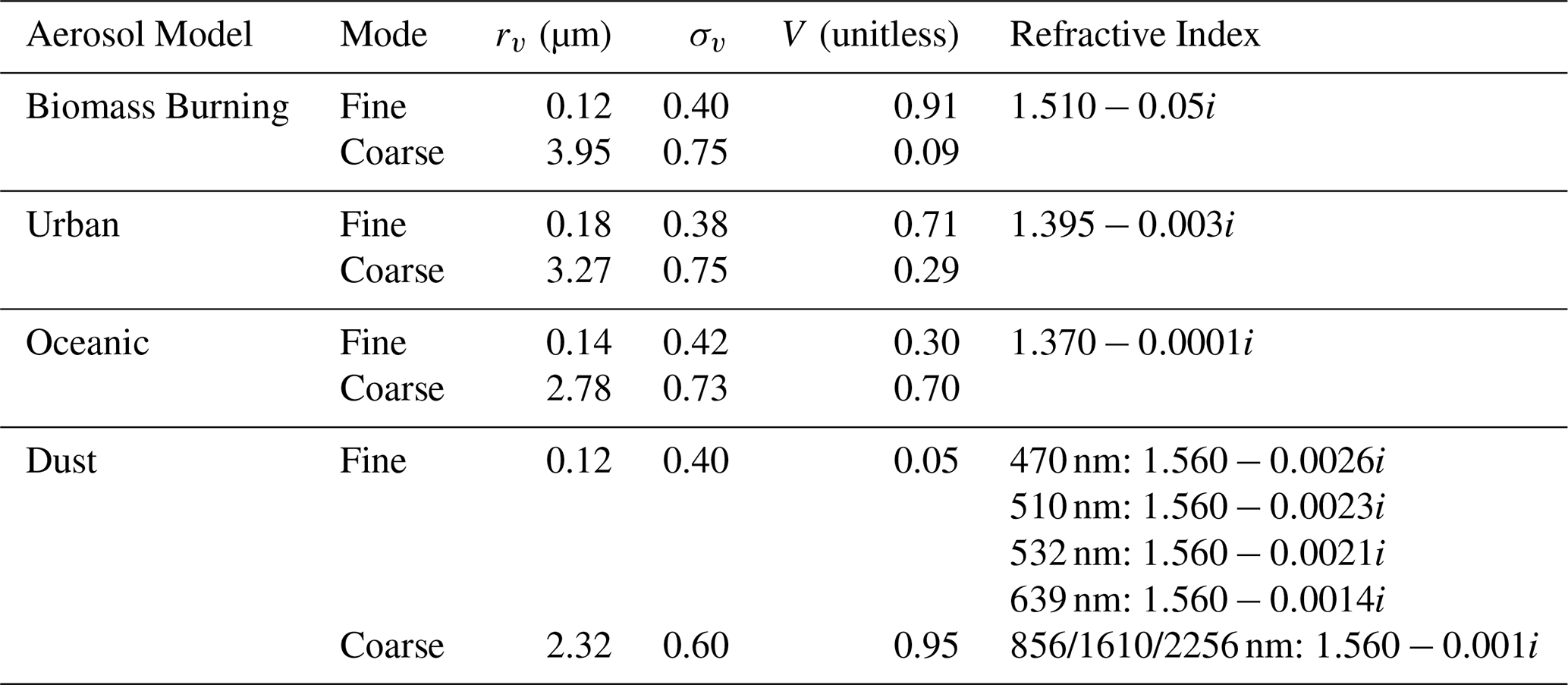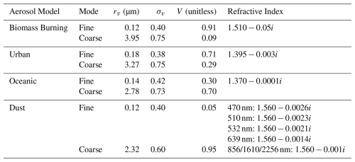 Table 2Size distribution parameters and optical properties of the four aerosol models used in this study (Biomass burning, Urban, Oceanic and Dust). For each mode of each aerosol model, rv is the volume median radius, σv is the standard deviation of the volume size distribution.