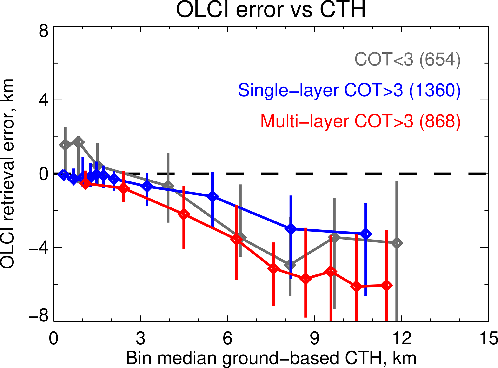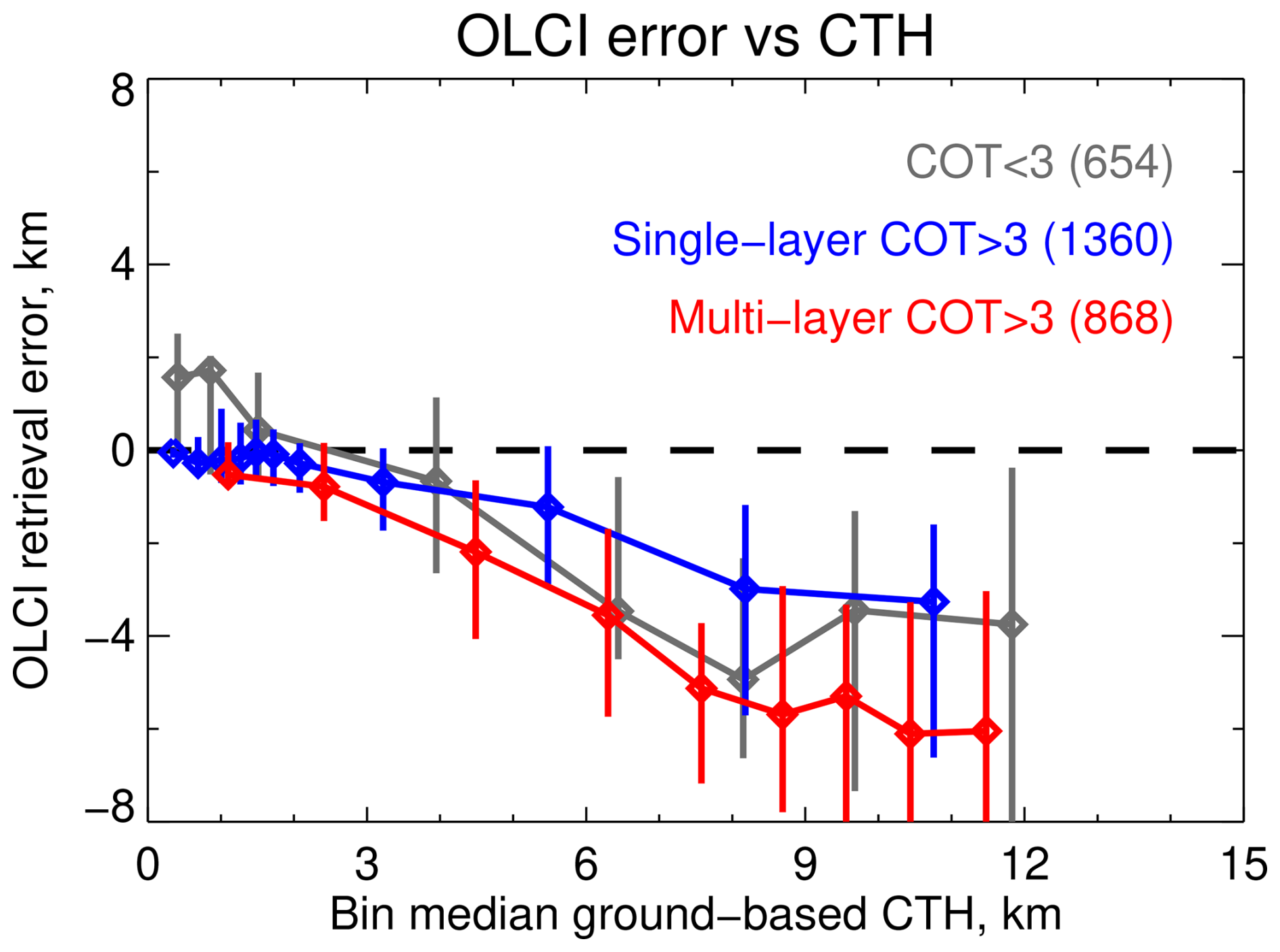Figure 3OLCI CTH error as a function of ARM CTH. Diamonds and lines show bin median and central 68 % of data, respectively. Data are split into COT <3 (grey), single-layer COT ≥3 (blue), and multi-layer COT ≥3 (red) cases. Numbers in parentheses indicate counts for each category. The dashed black line indicates zero error.