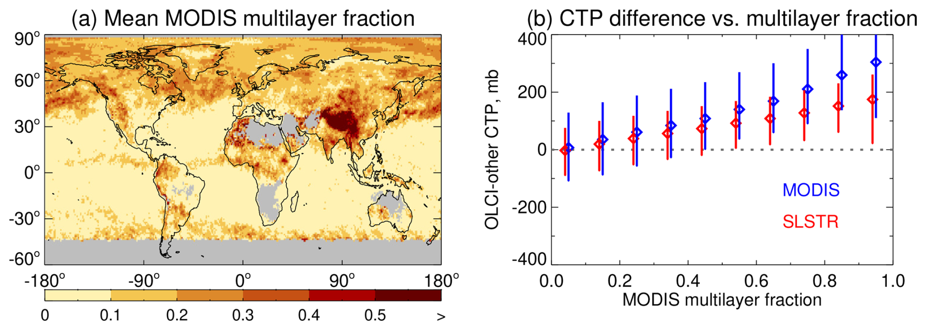 Figure 10(a) Mean fraction of clouds detected as multi-layer by MODIS. Grid cells with fewer than three days contributing are shaded grey. (b) Binned OLCI vs. other CTP difference as a function of MODIS multi-layer fraction. MODIS (blue) and SLSTR (red) data are offset horizontally slightly for clarity. Diamonds and lines show bin median and central 68 % of data, respectively; the zero line is dashed grey. In both panels cases, data are shown for co-sampled grid cells by the three sensors in July 2019.