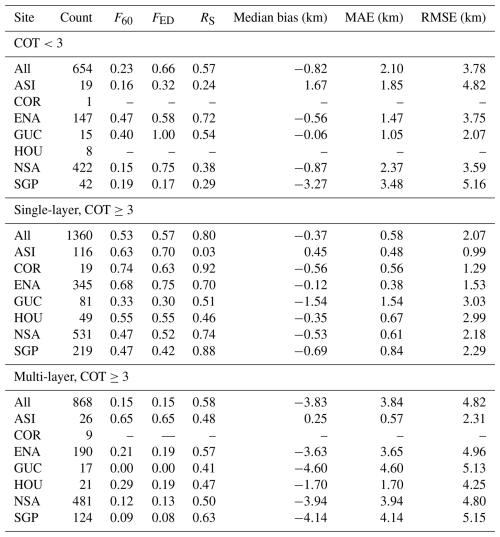 A statistical summary of the OLCI CTH validation results are shown for each site and category in Table 1; the equivalent for MODIS are in Table 2. We describe the importance of these metrics in the discussions below. In general, we focus on robust metrics such as Spearman's rank correlation coefficient over Pearson's linear correlation coefficient, and median rather than mean bias. Some variability in retrieval performance between sites is expected as ASI and ENA are islands while NSA is snow-covered and at large solar zenith angles; in Sayer et al. (2023) we found, based on simulated retrievals, that (compared to land) errors should be smaller for ocean scenes and larger for snow- or ice-covered scenes. This fact is particularly relevant when examining bulk comparison statistics since (due to its high latitude and so more frequent overpasses), the NSA site provides over half of all matchups. Additionally, ASI, COR, GUC, and HOU were temporary ARM sites not available for the whole analysis period (hence fewer matchups).