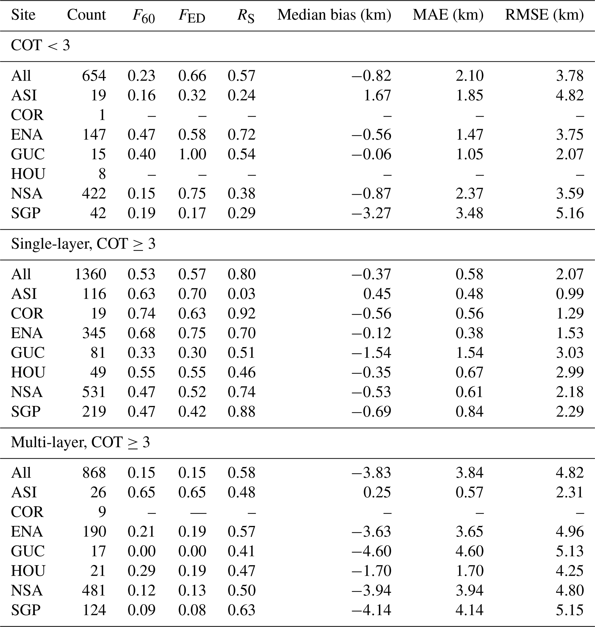 Table 1OLCI CTH validation summary statistics for each site for the three analysis categories. F60 and FED are the fraction of matchups meeting the 60 mb goal and agreeing within the expected discrepancy, respectively (the latter discussed in Sect. 3.3). RS is Spearman (rank) correlation coefficient. Matchup count, median absolute error (MAE), and root mean square error (RMSE) are also shown. Metrics are not reported for categories with fewer than 10 matchups.