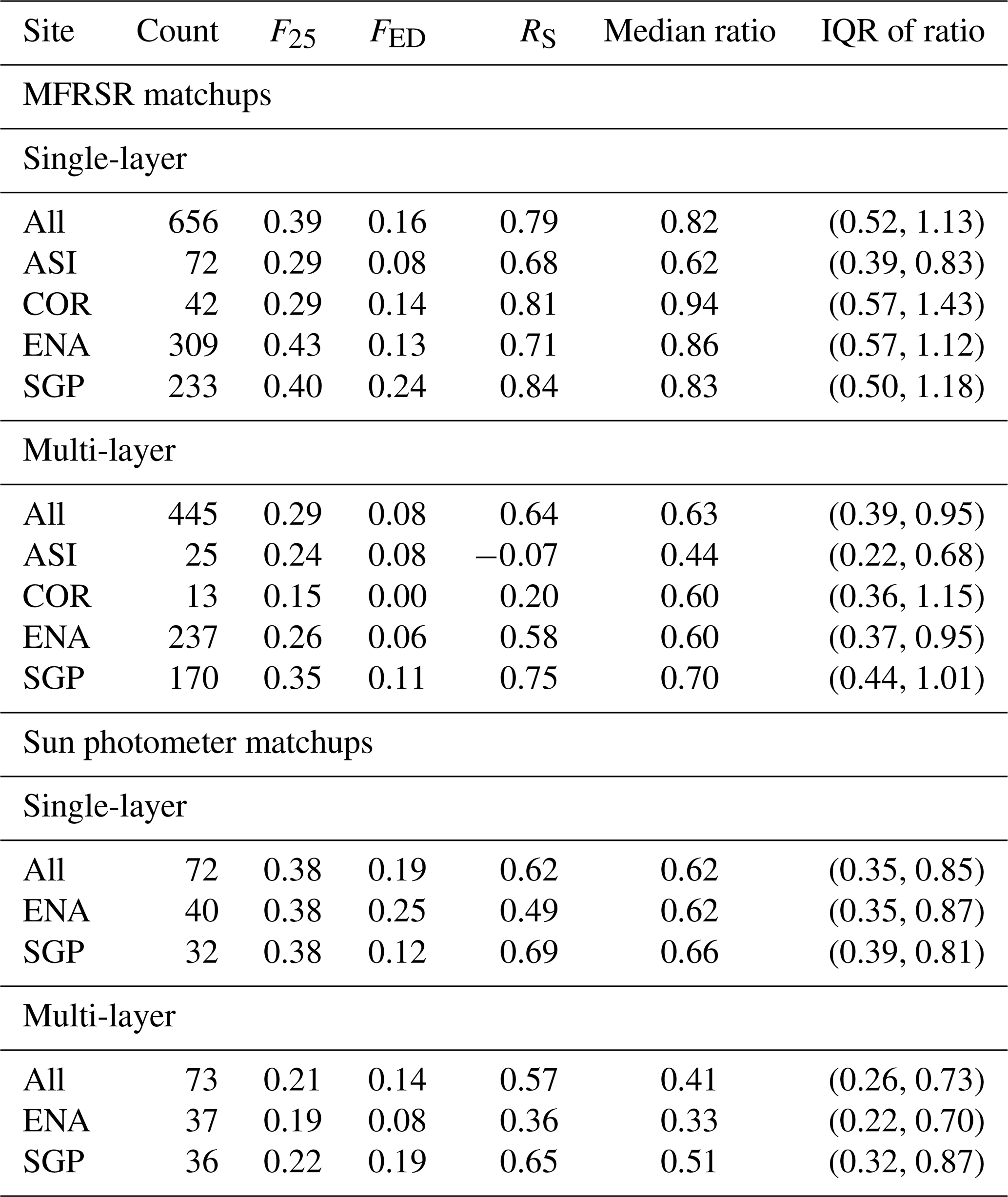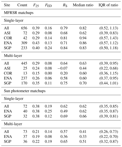 As discussed in Sect. 2.2, ARM has liquid COT data from two techniques: MFRSR and Sun photometry. These are independent techniques with different assumptions, and fortunately both are available at the ENA and SGP sites. Figure 7 compares these two data sets, for the data coincident with MODIS matchups (results for OLCI are numerically similar but with a smaller data volume). This shows that the two ARM COT data sets are well-correlated with one another but MFRSR COTs are about 30 % lower, with the interquartile range (IQR) of ratios from 0.57 to 0.85. This 30 % offset between the two is consistent between sites and larger than the PACE goal COT uncertainty for liquid clouds of 25 %, which presents a challenge in terms of using these to evaluate satellite retrievals as it is not clear which is more accurate. Interestingly, a similar analysis for SGP by Chiu et al. (2010) did not find such an offset, although their MFRSR COT was retrieved independently from the ARM operational algorithm (McFarlane and Shi, 2012). Additionally, a comparison of MFRSR retrievals vs. aircraft cloud probes from eight profiles at SGP by Min et al. (2003) found a higher level of agreement in COT. An earlier study by Min and Harrison (1996) did find MFRSR COT higher by a factor of ∼ 2 than geostationary retrievals for thick (COT >10) clouds, but due to the older instruments and retrievals used it is not clear whether those results would be reflective of current data. The offset seen in our results is, however, consistent with the recent analysis by Sookdar et al. (2025) who also compared (for a more restrictive subsetting to stratocumulus clouds without ground-level precipitation) Sun photometer and MFRSR COT at the ENA and SGP sites.