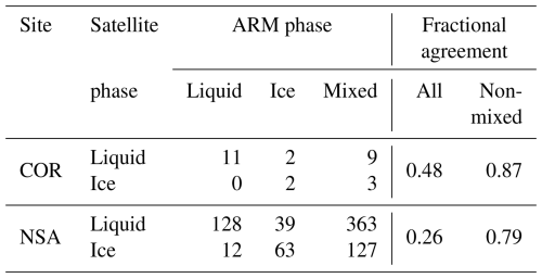 Thermodynamic cloud phase (THERMOCLOUDPHASE; Shupe, 2007) takes in multiple VAPs and identifies each cloud layer in KAZRARSCL as liquid water droplets, ice crystals, or mixed-phase. This is provided on a 30 s time cadence, and is only available at the high latitude sites (COR and NSA). While CHROMA (and MODIS) do not include mixed-phase cloud retrievals, we retain this category in order to better understand how the satellite retrievals behave in these situations. Additionally, we classify as mixed-phase any column which contains either mixed-phase layers, or contains both liquid and ice-phase layers.