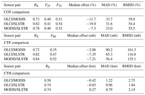 For COT, OLCI and SLSTR agree with one another better than either do with MODIS, on all metrics in Table 7 except median offset. The fact that these sensors are on the same satellite probably contributes to this – although MODIS on Terra has a similar overpass time it has a different orbital cycle and, even restricting to grid cells seen on the same day as here, the clouds might not be seen at the same times as viewed by OLCI and SLSTR on Sentinel-3A. Thus there is additional discrepancy expected due to spatiotemporal variability in the clouds seen. Unfortunately, MOD08 does not provide averaged observation times so it is not possible to filter based on Terra vs. Sentinel-3A time difference using these files. A related factor is that high latitudes are relatively overrepresented in the sample due to orbital characteristics. Additionally, the MODIS cloud product is known to have some across-track patterns in retrieved properties. For example, in the previous MODIS Collection 5, Maddux et al. (2010) found (their Fig. 2) a tendency for higher liquid and ice COTs near nadir (view zenith angles up to 10°) compared to near the edge of swath (view zenith angles of 60° or higher). Although that analysis concerned an older version of the MODIS algorithm, the underlying reasons – a combination of retrieval assumptions and the fundamental physical differences (both in sensitivity and what is observed) between viewing clouds from near nadir and at oblique angles – likely persist in some form, and similar phenomena likely affect the OLCI and SLSTR retrievals as well.