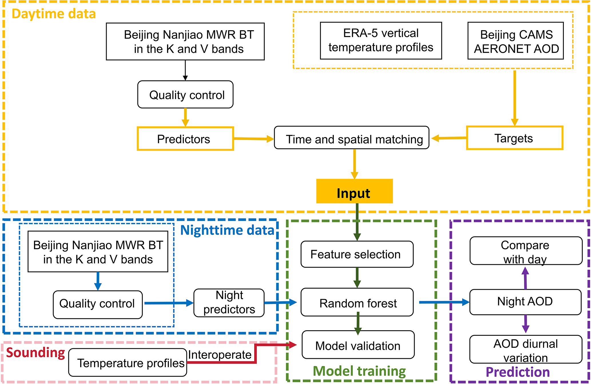 The AERONET AOD data are used for training and validating the model. Specifically, daytime AERONET AOD data are used for model training and testing. To ensure the representativeness of the sampling, we have partitioned the data such that the three-quarters of the data in each month are designated as the training set, while the remaining one-quarter serves as the testing set. After training, nighttime MWR BT measurements are input into the model to generate nighttime AOD estimates. These estimates are then compared with nighttime AERONET lunar AOD measurements for validation.