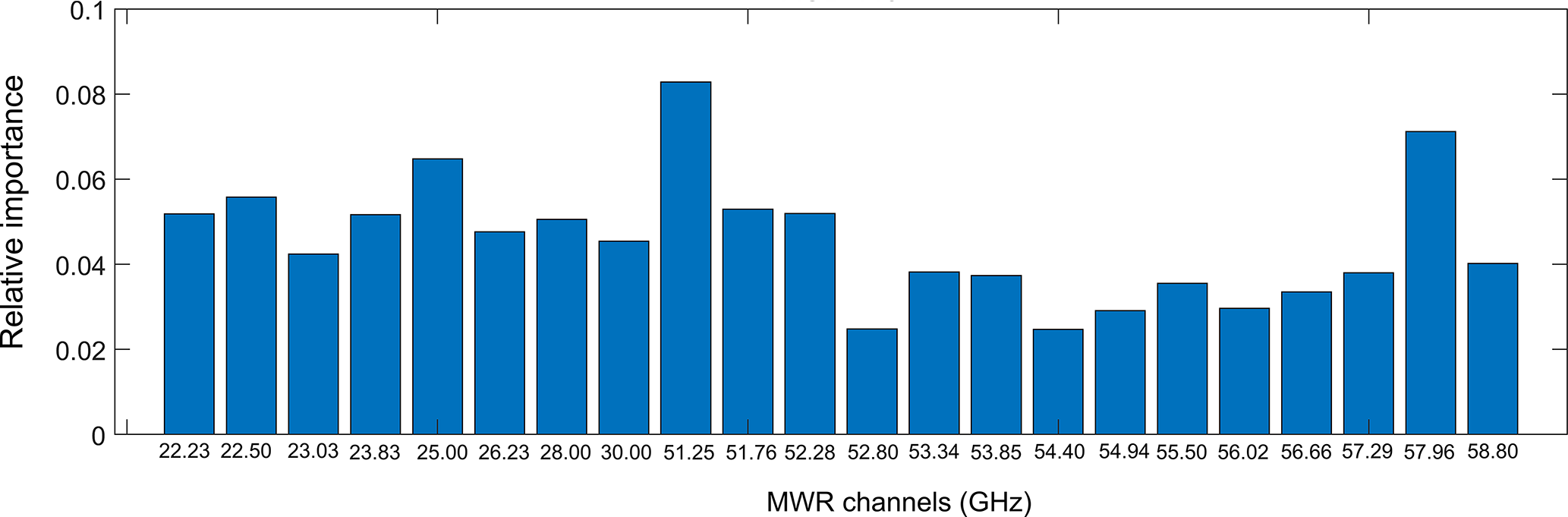 Figure 3Relative importance of all BTs in different frequencies measured by MWR in the RFR model. The vertical axis represents relative importance (unitless), and the horizontal axis corresponds to different variable inputs (BTs in different frequencies measured by MWR in the RFR model). These channels include 8 K-bands (22.23, 22.50, 23.03, 23.83, 25.00, 26.23, 28.00, 30.00 GHz) and 14 V-bands (51.25, 51.76, 52.28, 52.80, 53.34, 53.85, 54.40, 54.94 GHz, 55.50 56.02, 56.66, 57.29, 57.96, 58.80 GHz).