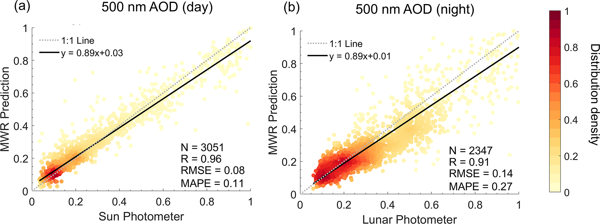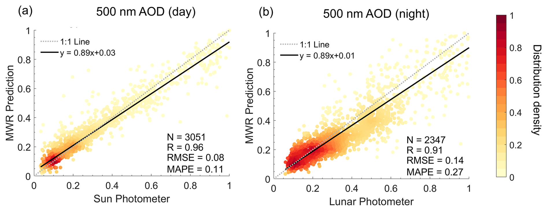Figure 5Density scatter plots of 500 nm AOD in the testing set of MWR and the photometer with (a) daytime and (b) nighttime. The dashed dark-gray line represents the 1:1 line, and the black solid line represents the linear regression line. Note that the daytime corresponds to 06:00 am to 06:00 pm local time (UTC+8), and nighttime corresponds to the remaining time.