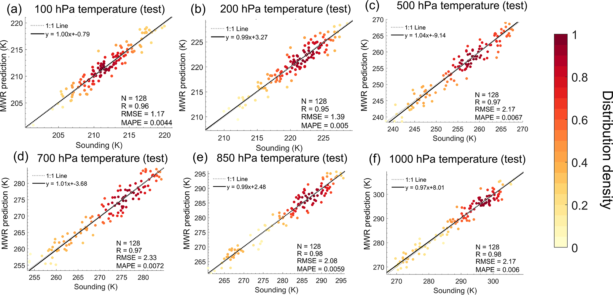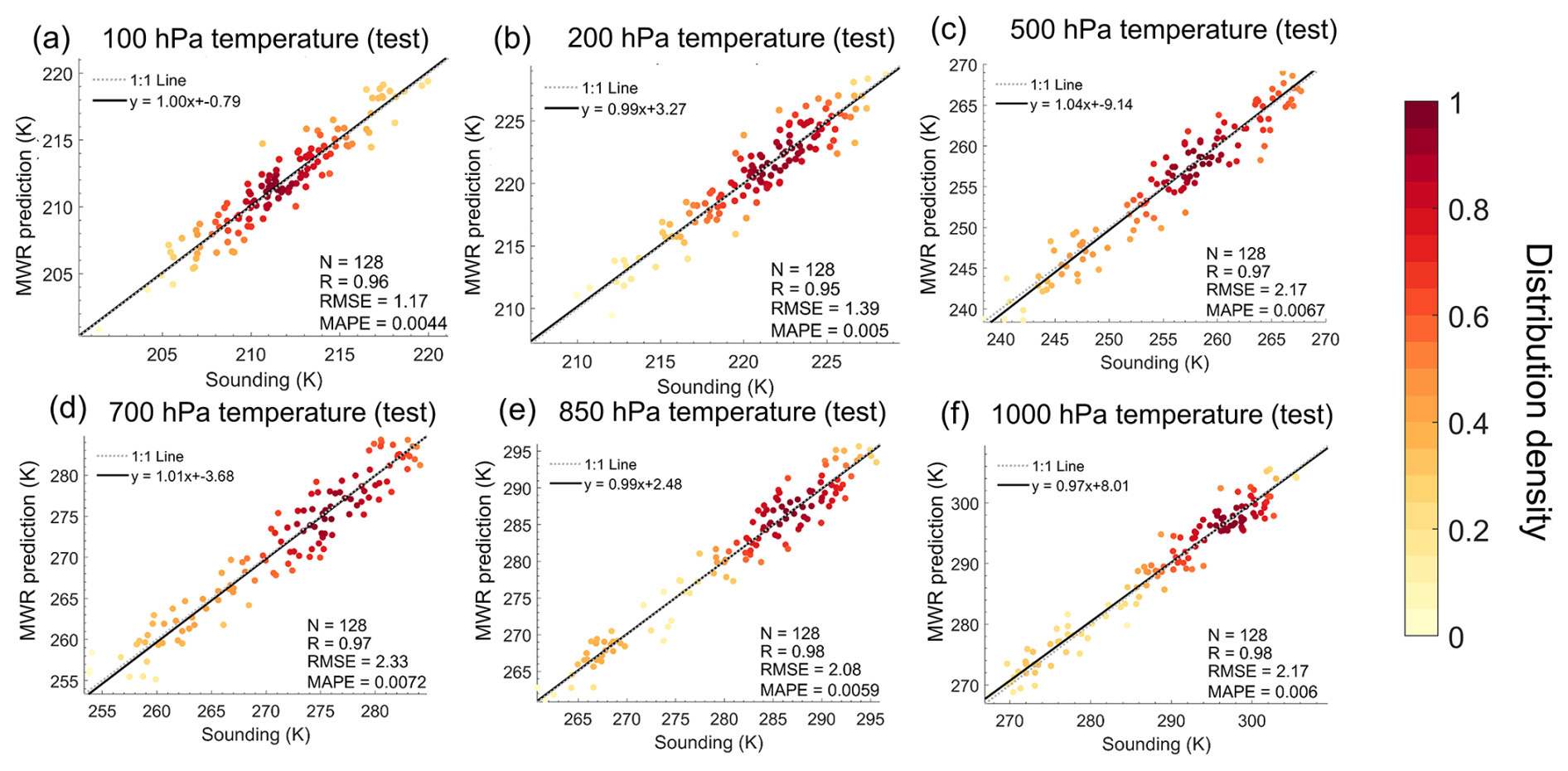 Figure 8Density scatter plots of the vertical temperature profile in the testing set of MWR and sounding data at (a) 100, (b) 200, (c) 500, (d) 700, (e) 850, and (f) 1000 hPa. The dashed dark-gray line represents the 1:1 line, and the black solid line represents the linear regression line.