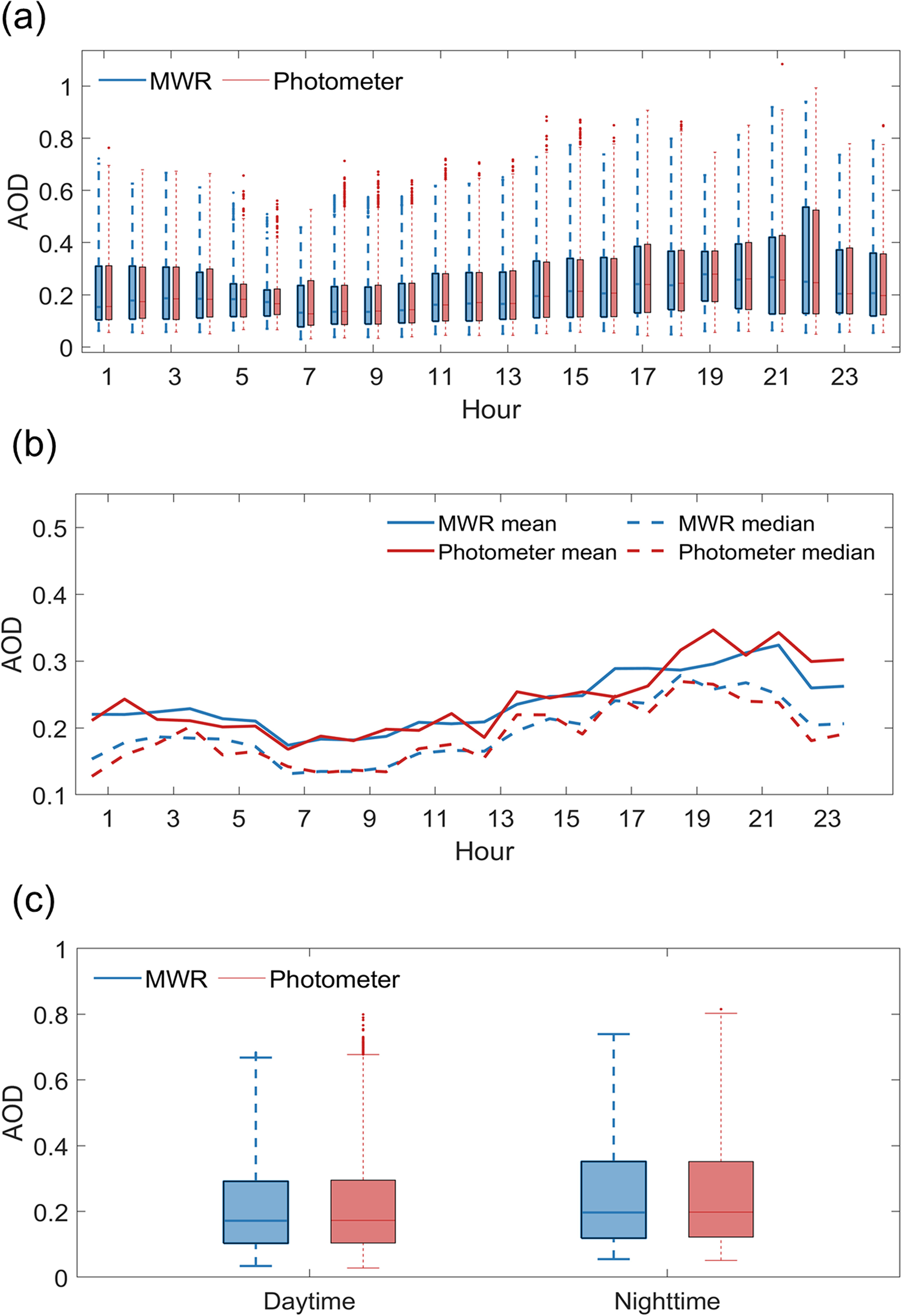 Figure 10The diurnal cycle of annual mean MWR AOD and photometer AOD at 500 nm. (a) The box plot of hourly MWR AOD (red box plots) and photometer AOD (blue box plots). The small dots represent outliers greater than or less than , where q75 and q25 correspond to 75th and 25th percentile. (b) The time series of mean AOD (solid lines) and median AOD (dashed lines) of MWR AOD (red lines) and photometer AOD (blue lines). (c) The box plot of daytime and nighttime AOD. Blue boxes correspond to MWR data, and red boxes correspond to photometer data.