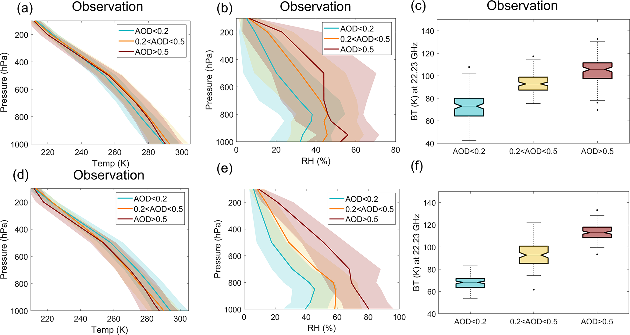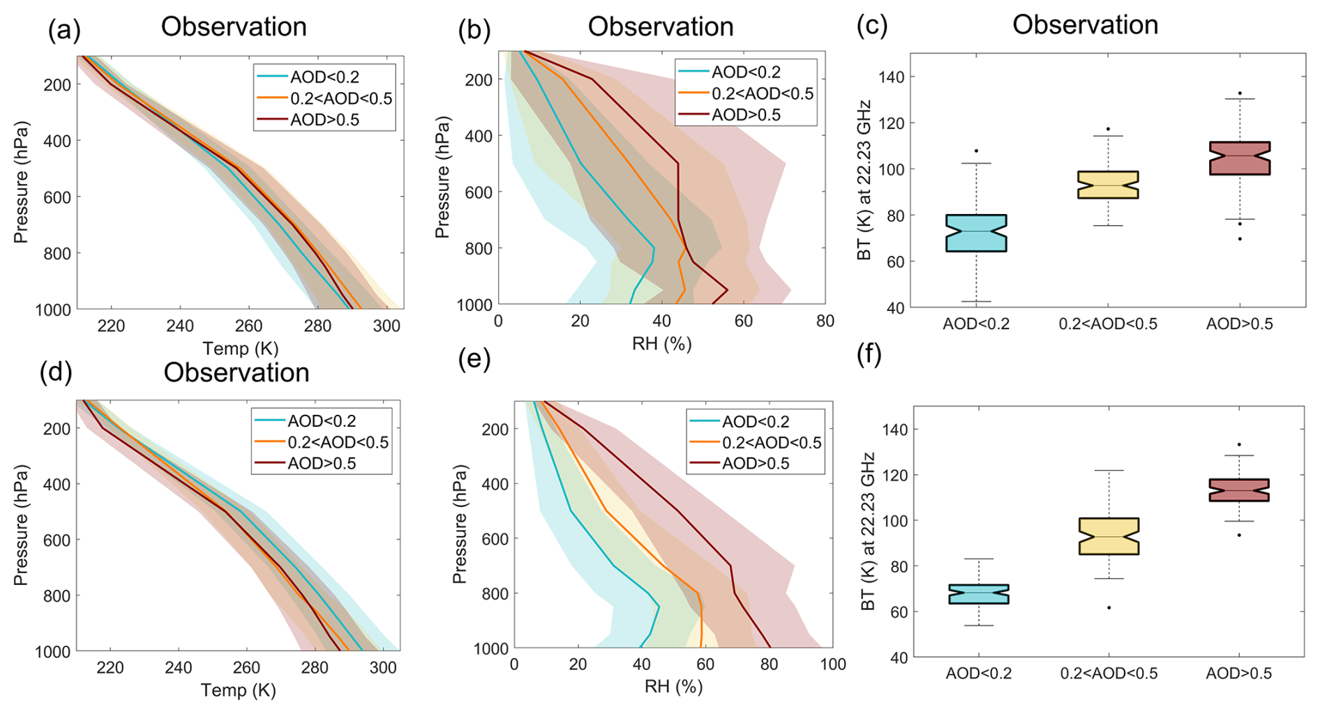 Figure 11(a–b) The observational vertical profiles of temperature (Temp, unit: K) and relative humidity (RH, unit: %) under various AOD levels at 550 nm. The cyan, orange, and red solid lines correspond to low-level polluted scenarios (AOD <0.2), mid-level polluted scenarios (0.2< AOD <0.5), and high-level polluted scenarios (AOD >0.5). (c) Their corresponding brightness temperature (BT, unit: K) at 22.23 GHz calculated by MonoRTM. (d–f) Similar to (a)–(c) but for the WRF-Chem simulation. The shading represents the spread of samples with 1 standard deviation. All differences have passed the significance test of p value ≤0.01 by Student's t test.