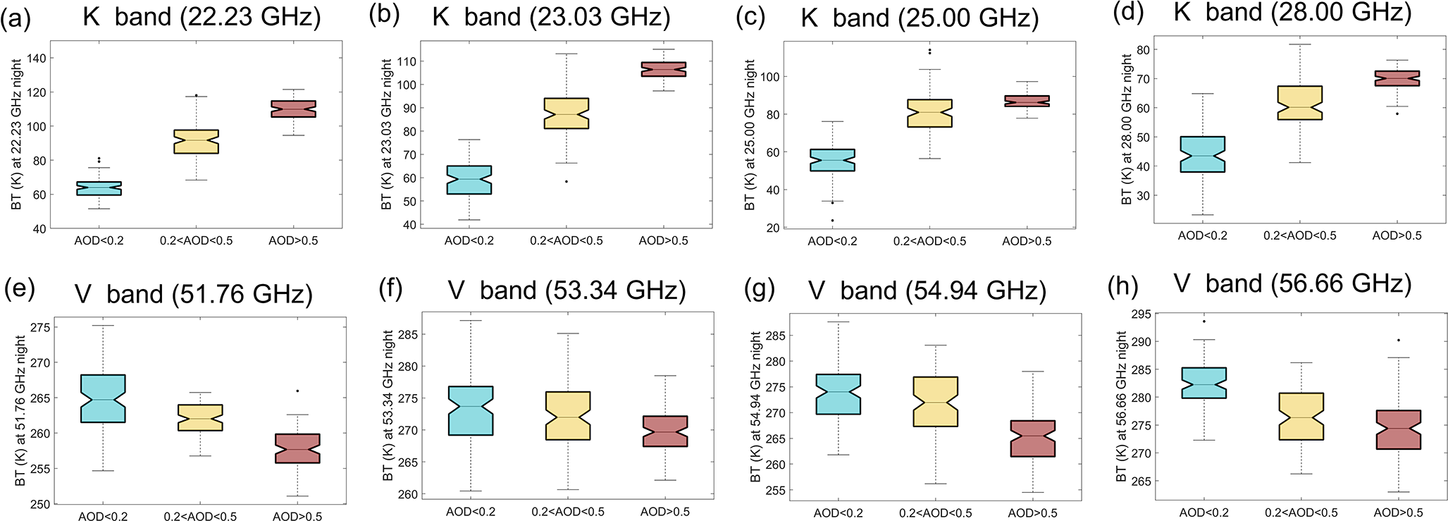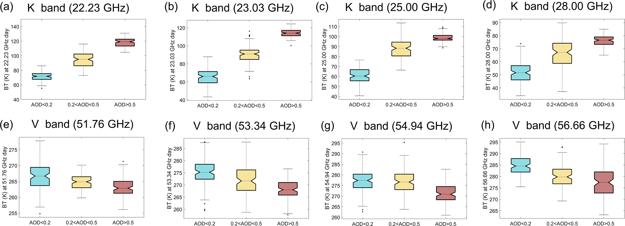 Figure 12The box plots of relationship between BT and AOD at 550 nm when fixing the surface temperature at 270–275 K from 00:00 UTC on 18 December 2016 to 00:00 UTC on 20 December 2016 in the WRF-Chem simulation. The frequencies of BT are (a) 22.23, (b) 23.03, (c) 25.00, (d) 28.00, (e) 51.76, (f) 53.34, (g) 54.94, and (h) 56.66 GHz during the daytime.