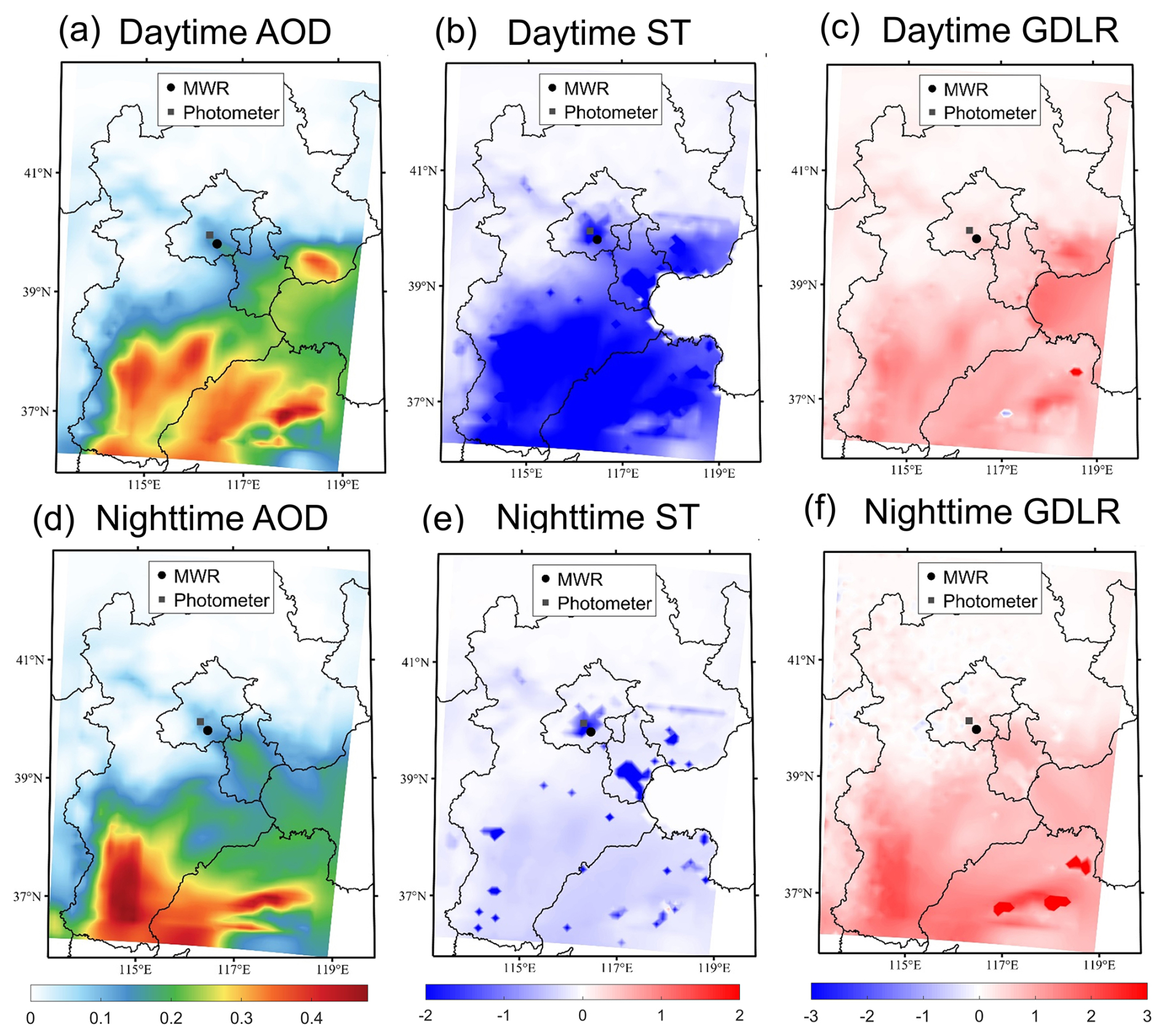 Figure 14The difference of (a, d) aerosol optical depth (AOD, unitless), (b, e) surface temperature (ST, K), and (c, f) ground downward longwave radiation (GDLR, W/m2) between EXP_AER and EXP_NOAER experiments (EXP_AER-EXP_NOAER) during the (a–c) daytime and (d–f) nighttime. The black circle indicates the MWR, and the dark-gray square indicates the photometer. The daytime corresponds to the period from 22:00 UTC on 18 December 2016 to 10:00 UTC on 19 December 2016. The nighttime corresponds to the period from 10:00 UTC on 19 December 2016 to 22:00 UTC on 19 December 2016.