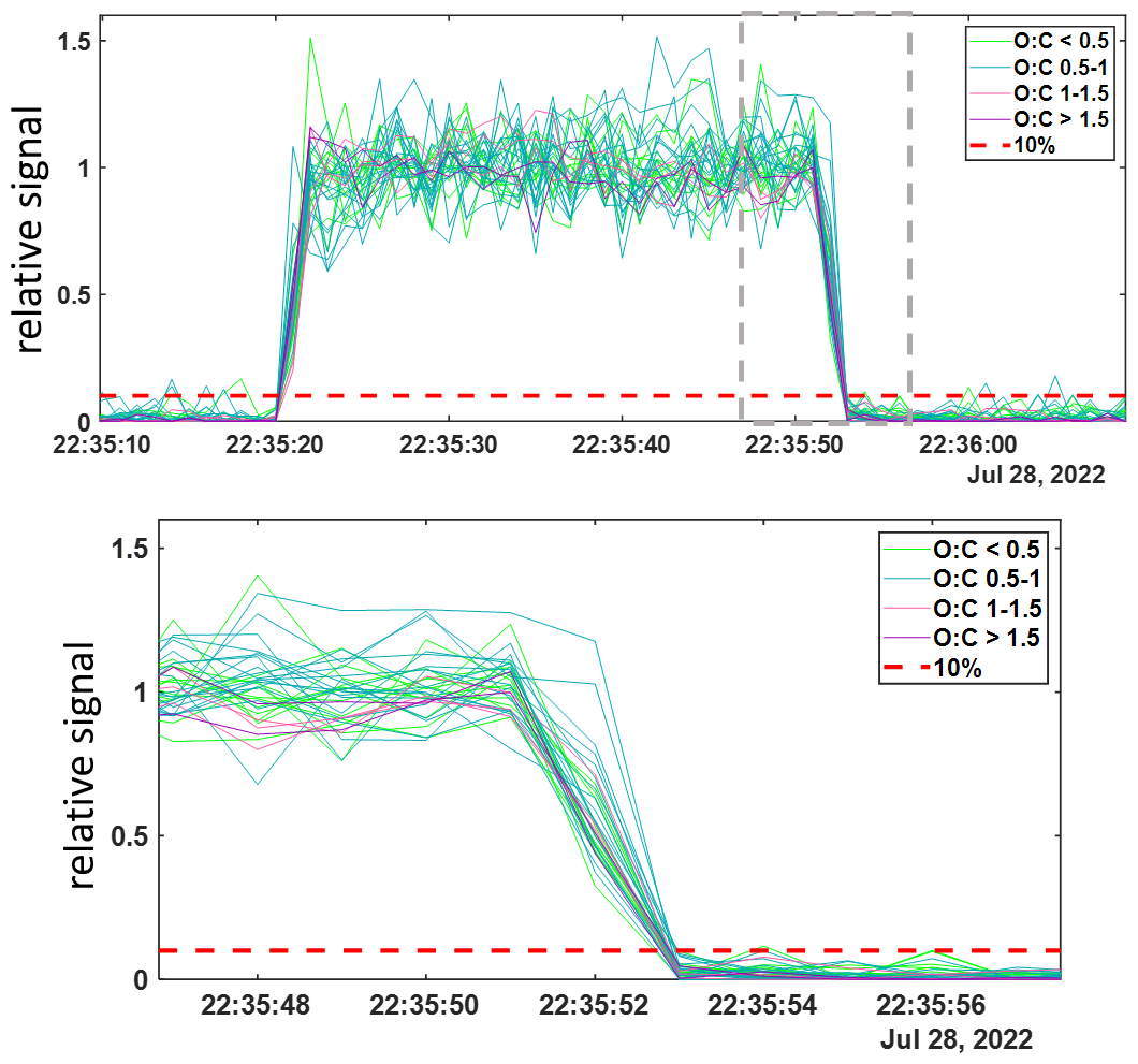 Figure 31 Hz time series of 35 α-pinene ozonolysis products generated in a laboratory study and detected in the t-IMR. Compounds shown colored by O : C ratio and reported in normalized signals relative to the averaged detected during addition. Relative 10 % signal lines shown in red. Bottom plot shows zoomed in view of time series as shown in grey box of top plot.