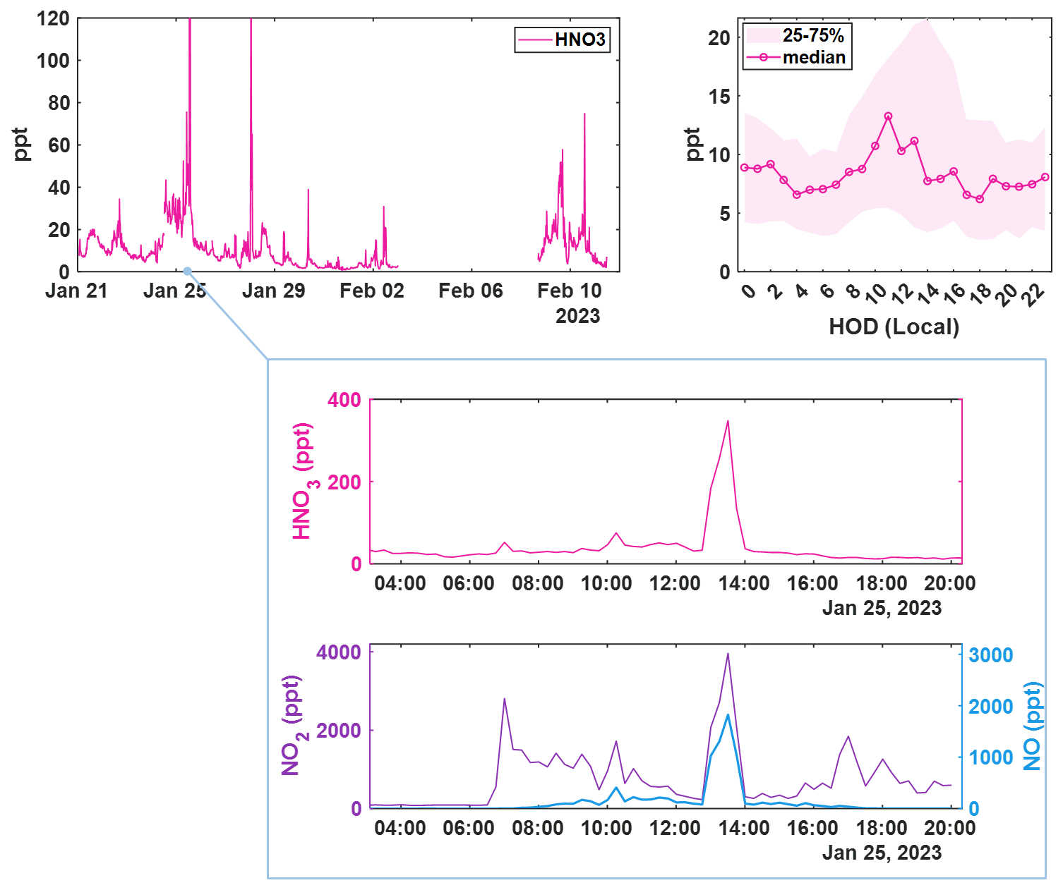 Figure 515 min averaged time series of ambient HNO3 concentrations measured during the winter BLEACH campaign (top left), corrected for IMR water vapor concentrations and the diurnal profile showing mean signal at each hour of day (HOD) in local time (top right). Shading indicates the bounds of the 25th and 75th quartiles for the measured concentrations in each hourly bin. A zoomed in view of a spike (middle) in HNO3 concentration as measured by CIMS coinciding with (bottom) measurements of NO (blue, right axis) and NO2 (purple, left axis) as detected by a Laser-Induced Fluorescence (LIF) instrument.
