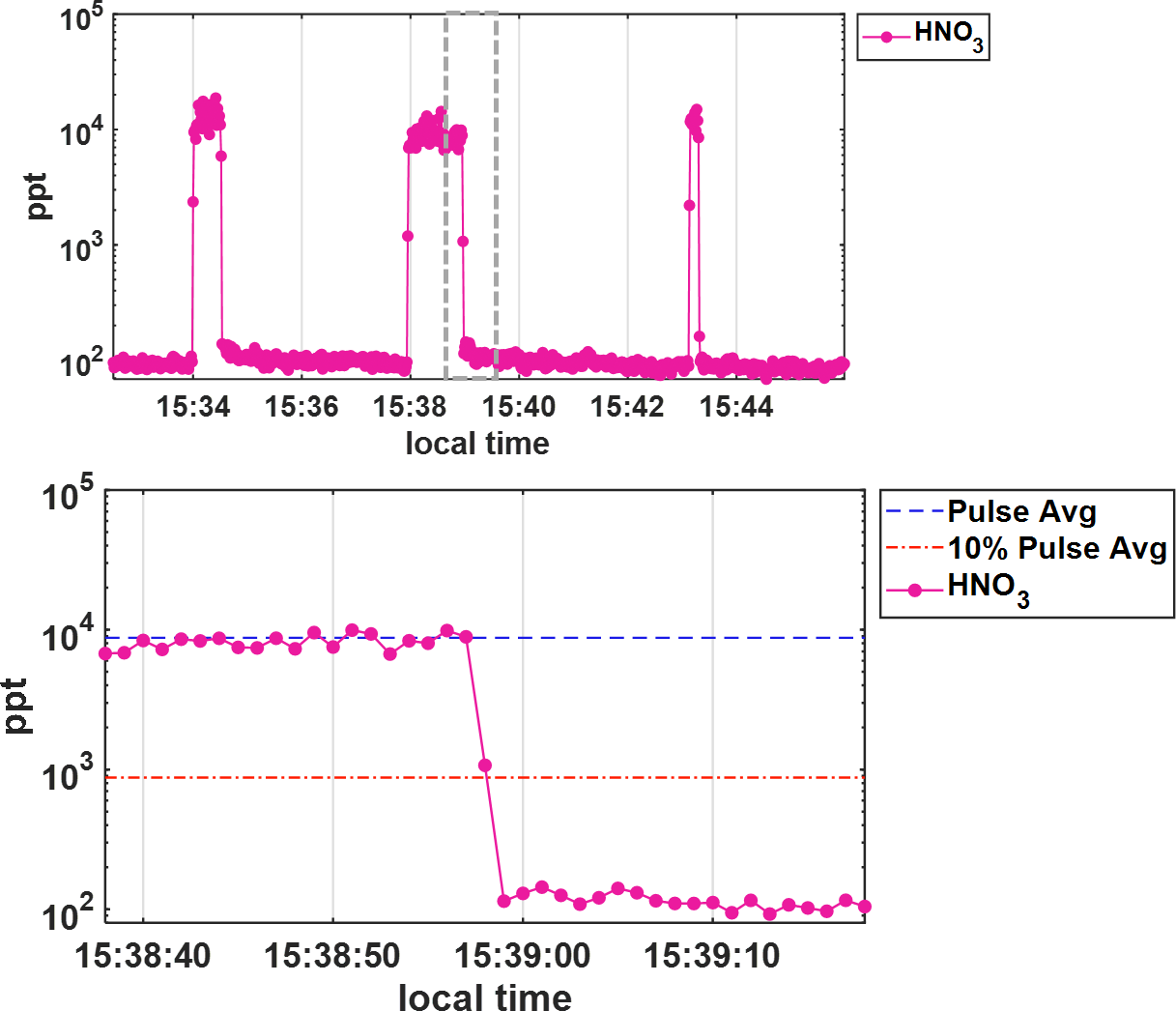 Figure A31 Hz HNO3 concentrations in ppt shown on a log scale during wall effects experiment where (top) HNO3 is added to the t-IMR in pulses of 20, 60, and 10 s, respectively. The bottom panel shows a zoomed in view (gray dashed box in the top plot) of the 60 s pulse, showing that concentrations return to below 10 % (orange dash line) of the average concentration during addition (blue dash line) on the order of 1–2 s.