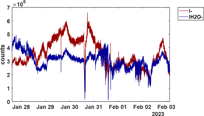 Figure A51 min resolved time series of I− (red) and IH2O− (blue) signals during the BLEACH23 campaign to demonstrate dynamic conditions with the t-IMR equipped CIMS.