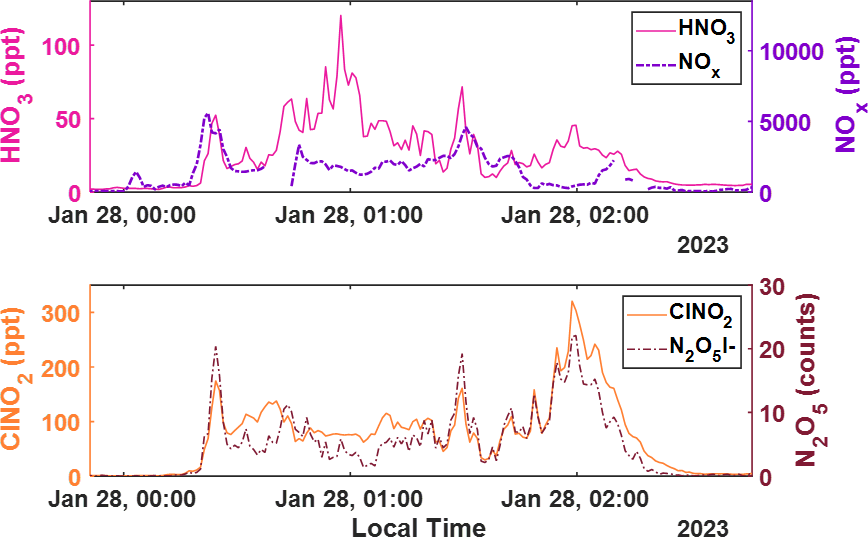 Figure A6Representative 1 min time series of (top) HNO3 and NOx concentrations in magenta and purple dashes, respectively; as well as (bottom) ClNO2 concentrations and signal counts of N2O5, respectively in orange and dark red dashes. The concentrations and signals of all but HNO3 are background subtracted.