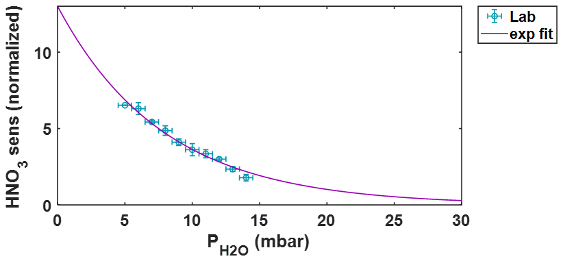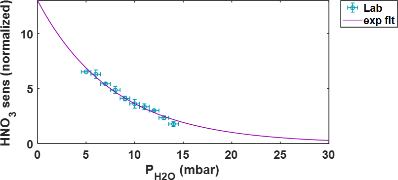 A similar experiment is performed while delivering HNO3 to the t-IMR, again while modulating humidity with a combined dry and bubbler flow. The experiment utilizes a custom made permeation device where concentrated nitric acid fills a permeable PTFE tube sealed at each end with solid PTFE caps. In this case, there are no in-field calibrations to extend available data to higher values. The results are shown in Fig. B2 with experimental data shown in blue. An exponential fit is applied (shown in purple in the figure), with an R2 value of 0.98 and equation formatted as , where y corresponds to HNO3 sensitivity, x to , with a and b as constants. This fit (and the experimental data shown) are normalized such that the sensitivity is equal to 1 for the average during calibrations (= 17.3 mbar). As with HOBr, the sensitivity is calculated at each time step using measurements, this normalized fit, and the HNO3 sensitivity based on in-field Br2 calibrations and BEs. This time series of sensitivity is then used to convert signals to concentration.