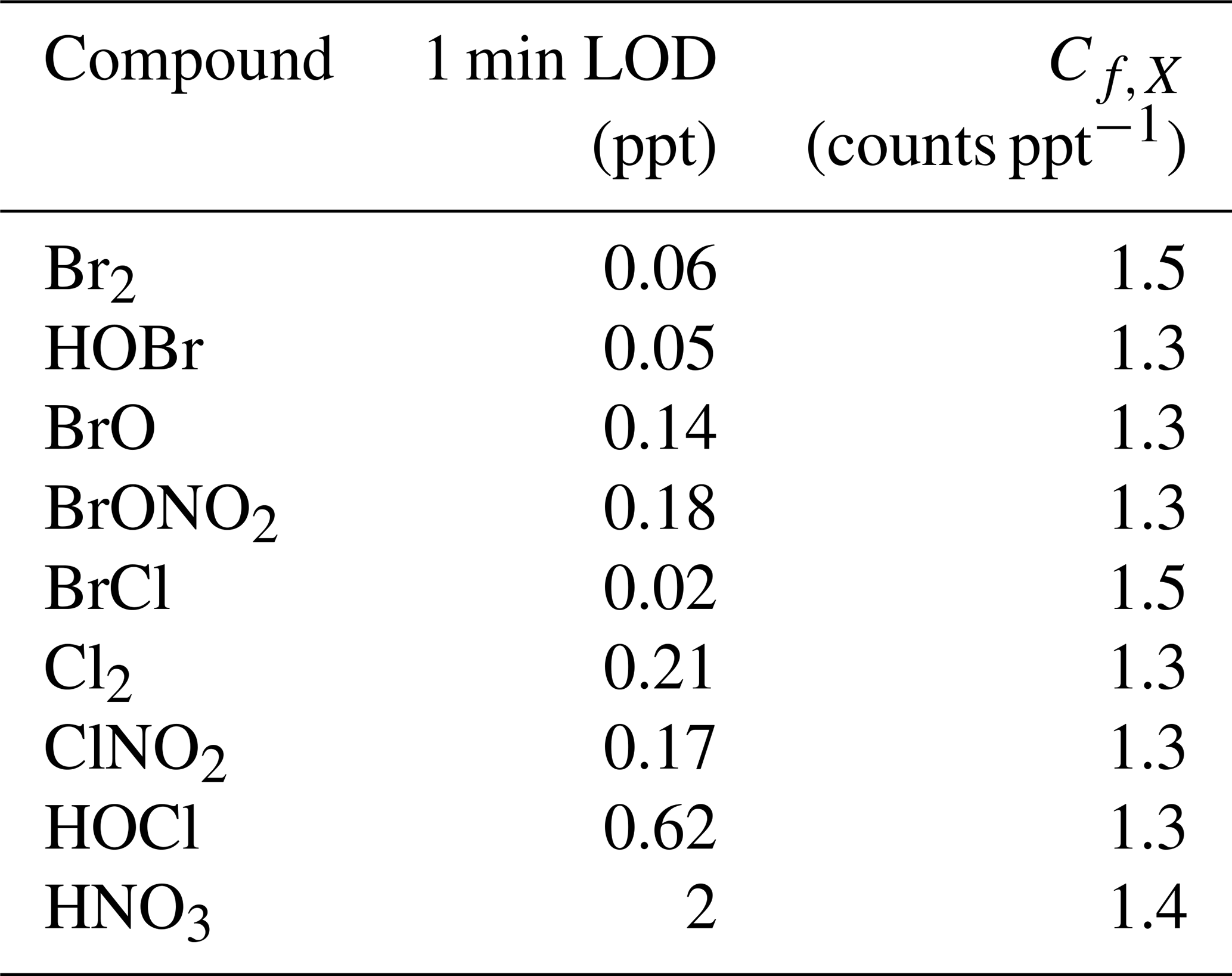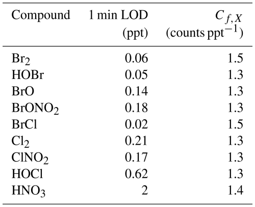 Table A1Limits of detection for halogenated species detected during BLEACH (calculated for 1 min integration time) and corresponding average sensitivity values (Cf,X) based on direct in-field Br2 calibration and Eq. (2).