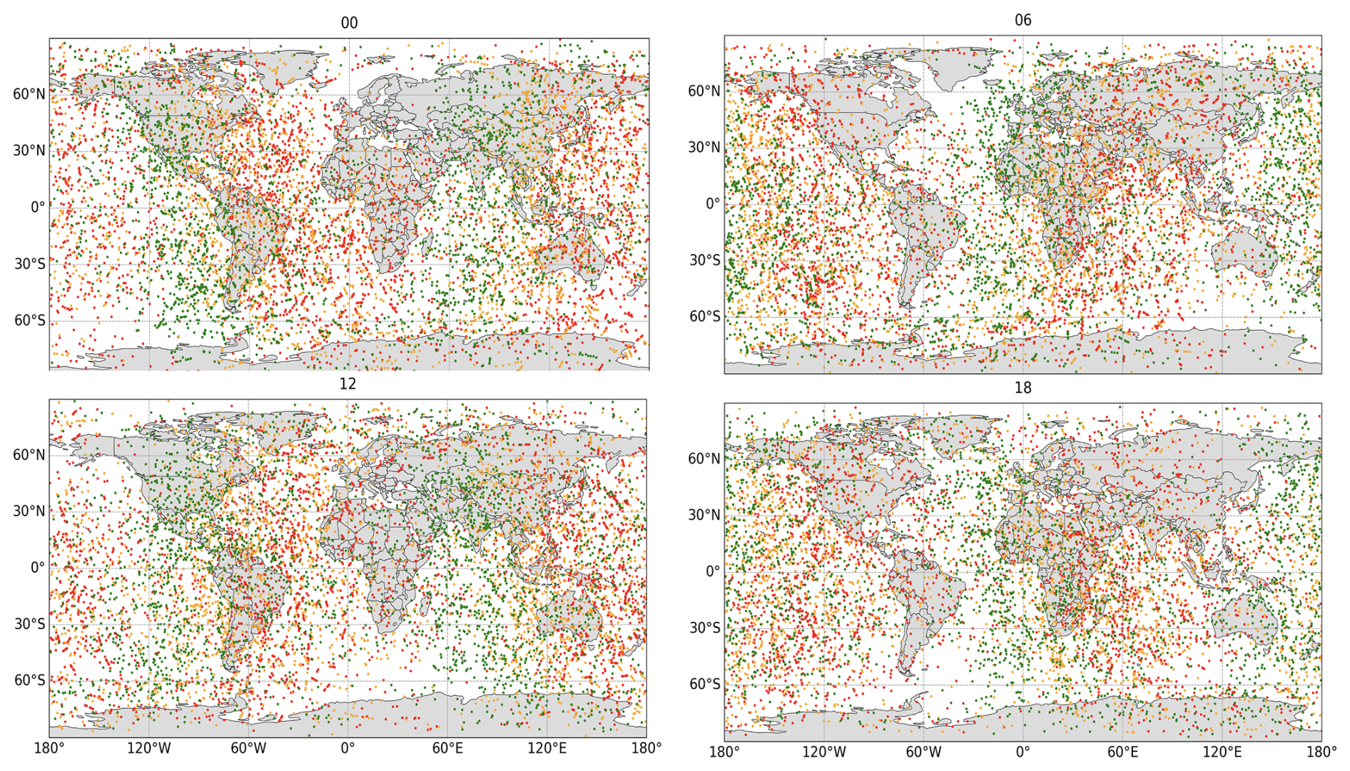 Figure 2Six-hourly distributions of CSY for one day (1 September 2022): 00:00–06:00 UTC (top left), 06:00–12:00 UTC (top right), 12:00–18:00 UTC (lower left), and 18:00–24:00 UTC (lower right). Colors indicate age of observation at the end of each six-hour window (red 0–2 h, orange 2–4 h, green 4–6 h). The youngest observations (red) have the most impact in the 6 h data assimilation cycle. These are UCAR-processed data that have passed QC. Figure prepared by Valentina Petroni.