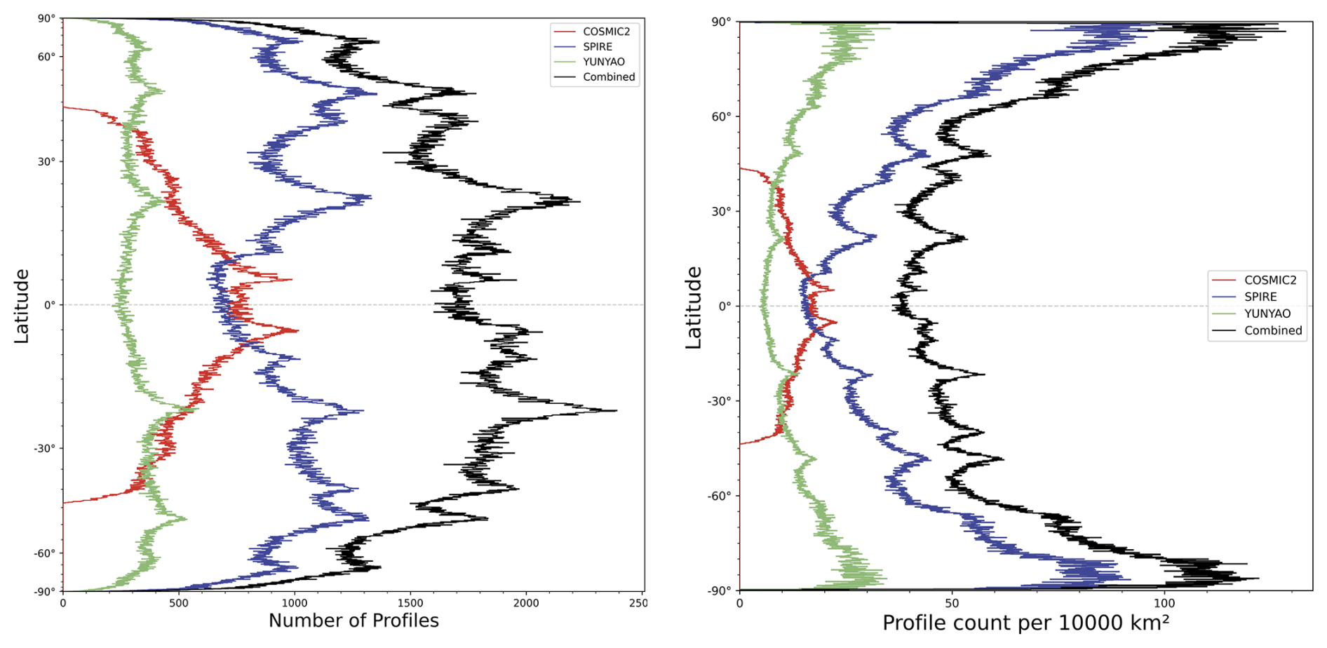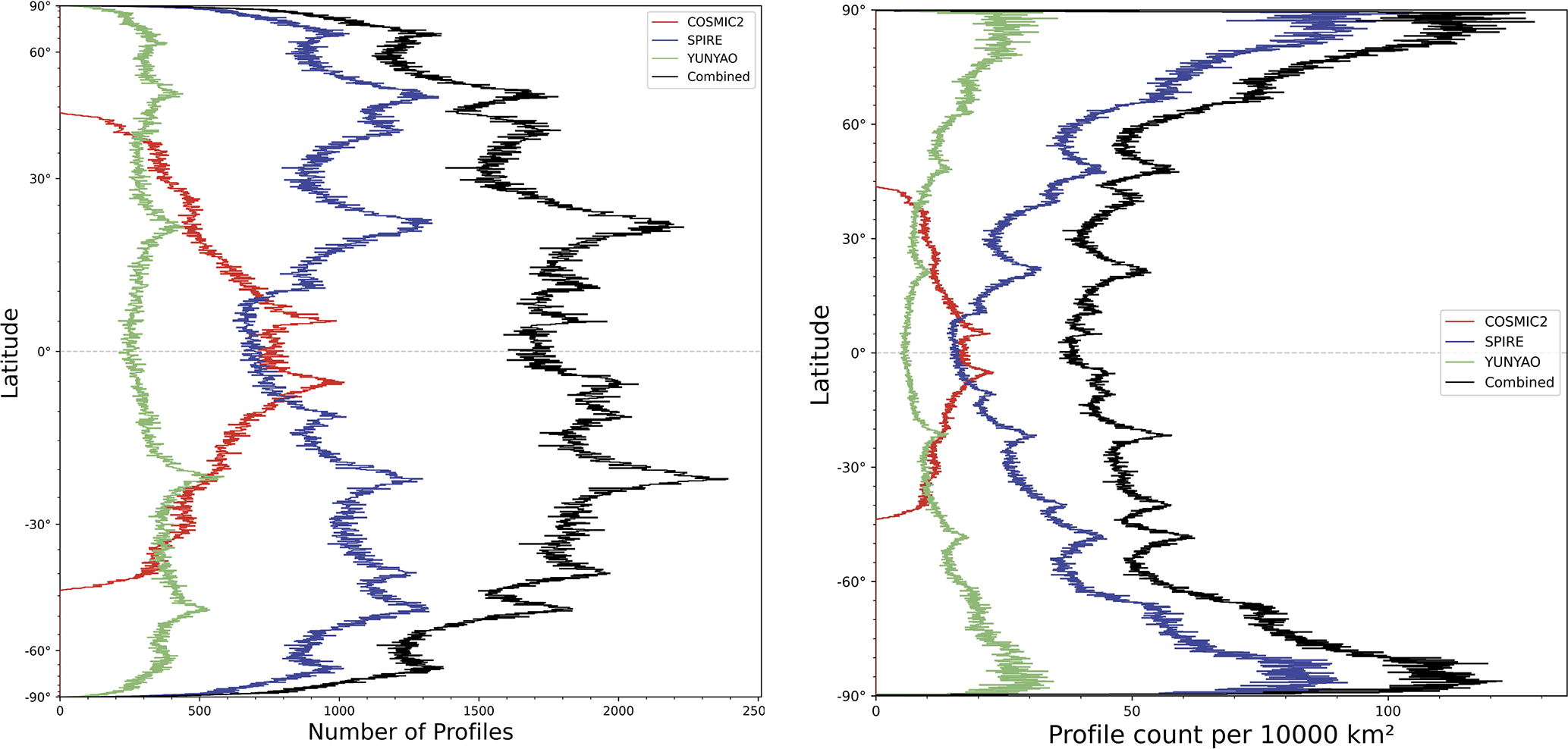 The total number of the C2, Spire, Yunyao, and CSY profiles for 0.1° latitude bands for the entire ROMEX period is shown in Fig. 5 from two different perspectives. The left panel shows total number vs. cos(latitude) while the right panel shows the total number density per 10 000 km2. The distributions of C2 (low-inclination orbits) complement the distributions of Spire and Yunyao, which are in high-inclination orbits.