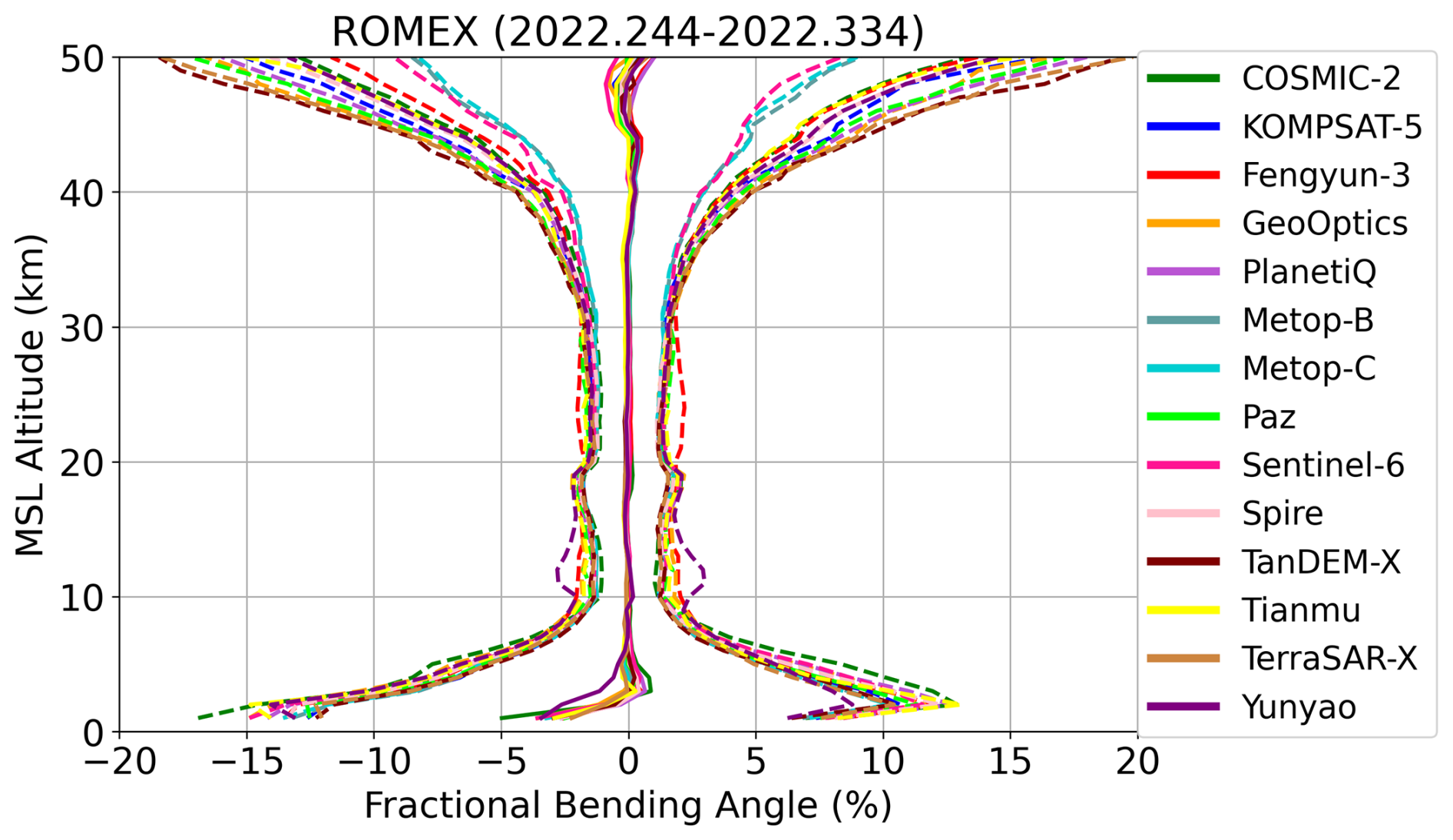 The bias of a sample of observations is . Truth is never known but, historically, RO observations have been considered to be largely unbiased above the lower troposphere because they are based on measurements of doppler shifts of the refracted signals using precise atomic clocks, which enables traceability to SI-traceable measurements of time (Leroy et al., 2006). RO observations are therefore assimilated in NWP models without bias corrections (Healy, 2008; Cucurull et al., 2014) and have been shown in many studies to act as “anchor” observations in the model forecasts (e.g., Aparicio and Deblonde, 2015), improving the impact of radiance measurements, which must be bias corrected. However, several early forecast experiments reported at the April 2024 ROMEX workshop showed small negative impacts on the biases of model forecasts when ROMEX data were assimilated, even though most forecast skill metrics showed positive impacts. Estimates of biases in ROMEX datasets with respect to other ROMEX data sets indicated possible biases of order ±0.2 %. Such small biases are not easily visible in commonly used verification charts of (normalized observations minus model background or a reference dataset), in which the relative biases and standard deviations of differences are often plotted together on a scale of −20 % to +20 % (e.g. Schreiner et al., 2020; Ho et al., 2023). The impact of ROMEX data on several model biases led to studies on possible sources of the model biases, including previously undetected small biases in the RO observations, model biases, biases in the forward model estimates of bending angle from the model data in the data assimilation process, suboptimal interactions with the bias correction of radiances, and small systematic errors in matching the heights of the model variables to the heights of the RO observations (1st and 2nd ROMEX workshops http://irowg.org/romex-events-meetings/, last access: 22 November 2025, Shao et al., 2025).
